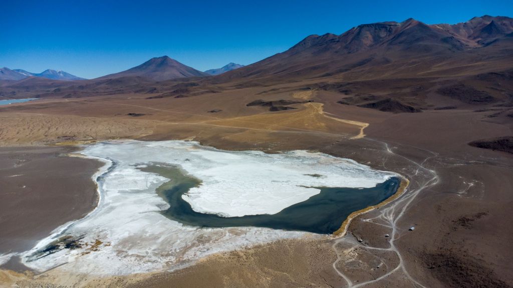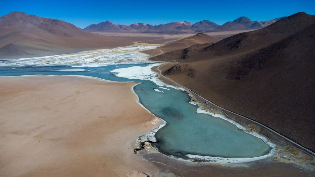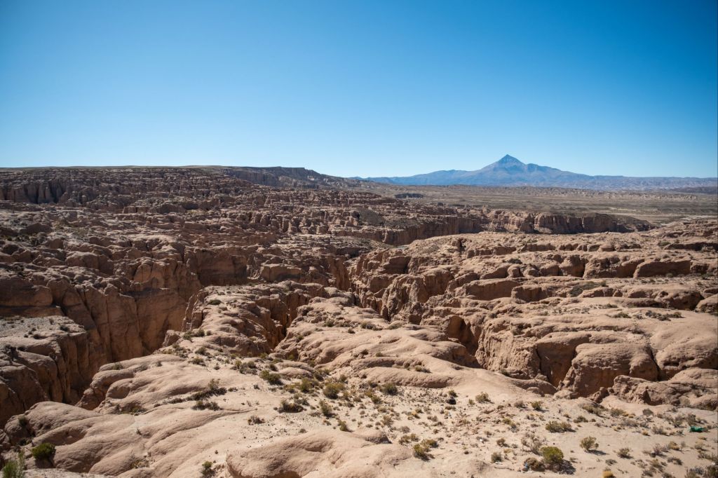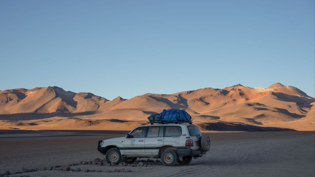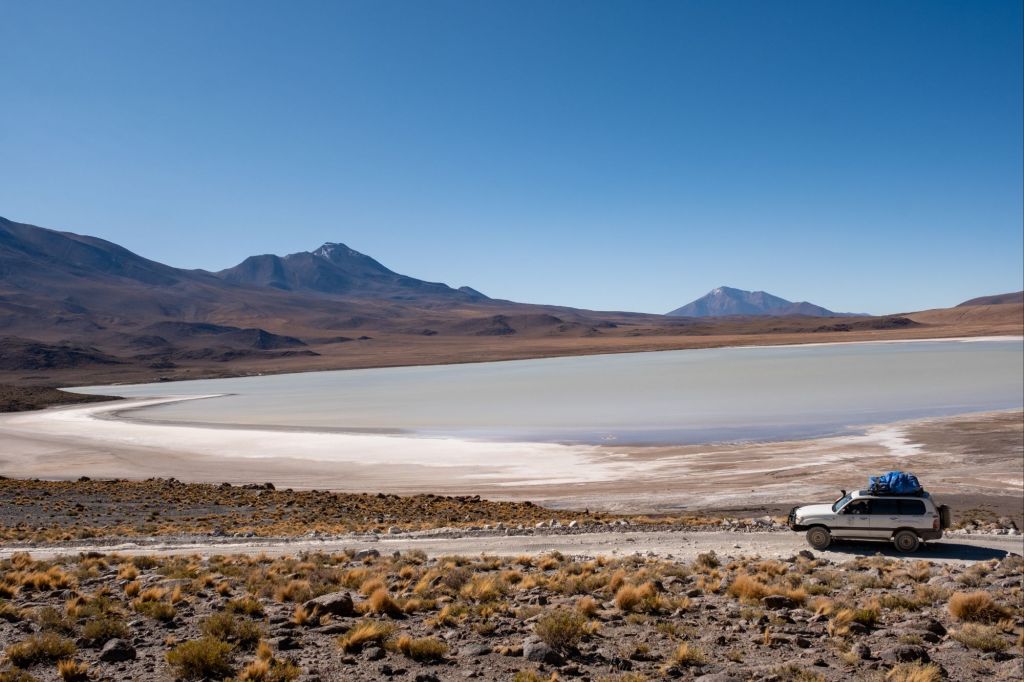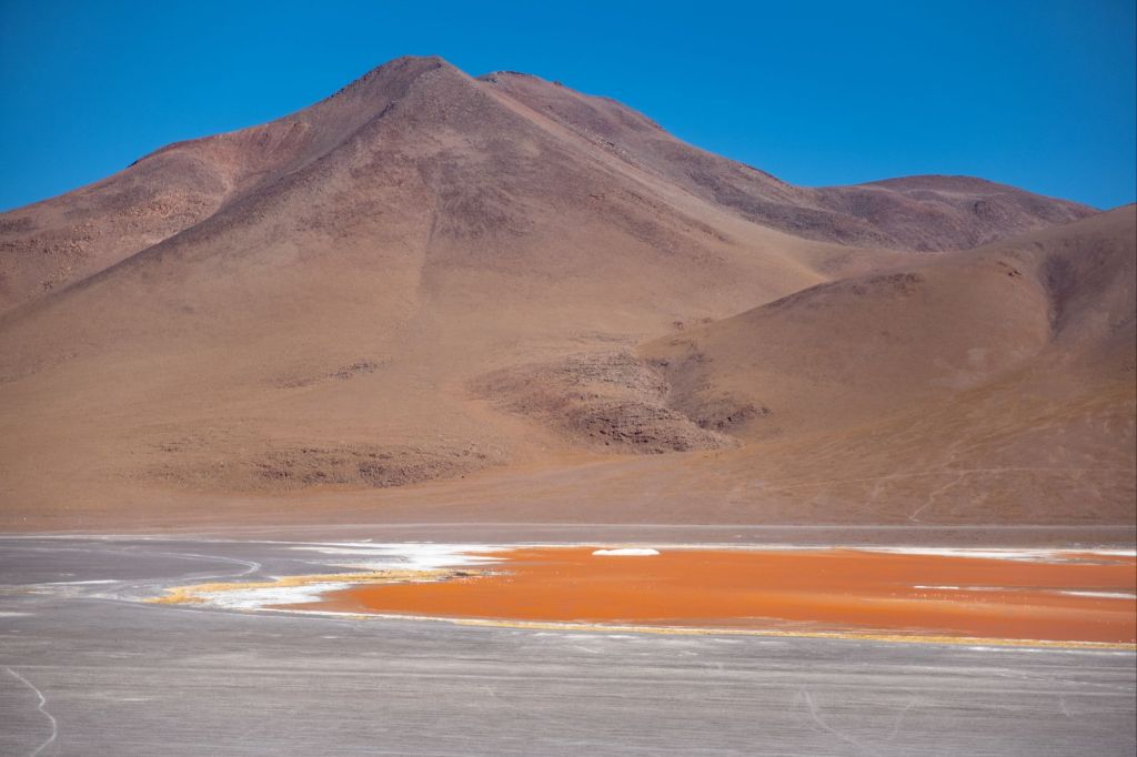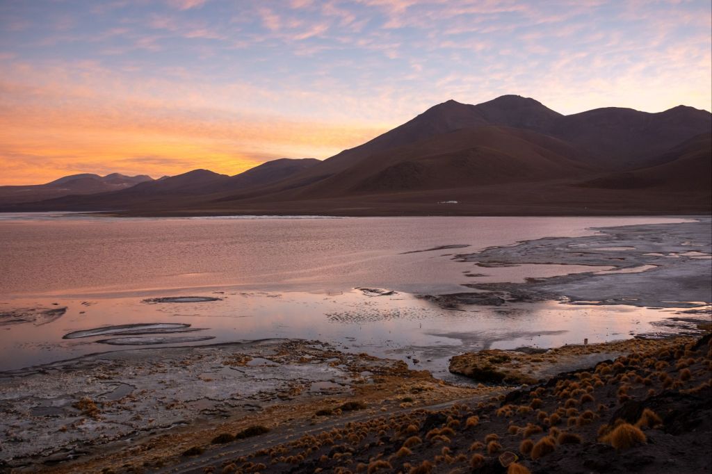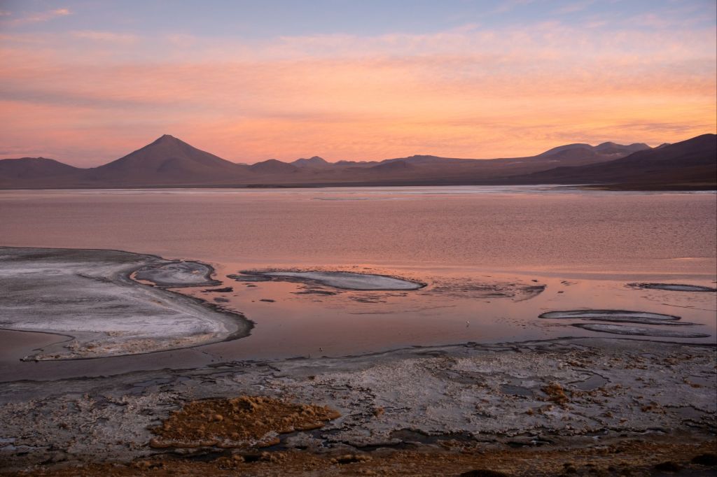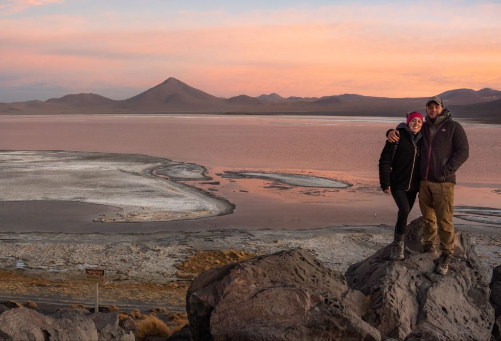 Comme c’est le dernier jour, nous avons le droit à un petit-déjeuner de luxe : pancakes en face du lever de soleil sur la lagune. Nos sacs sont prêts, et nous devons partir sans tarder car nous passons la frontière chilienne ce matin. En chemin, nous passons devant le Desierto de Dalí, qui porte ce nom car le paysage rappelle un peu ses célèbres peintures surréalistes.