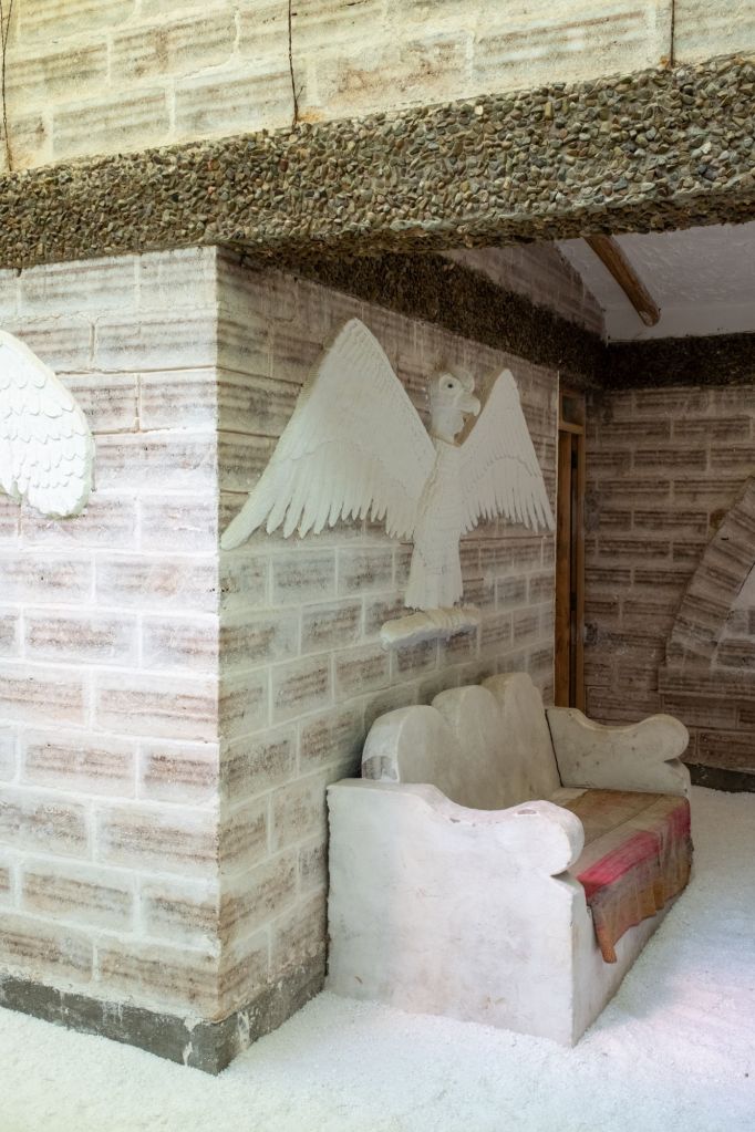 Ce soir, nous dormons dans un hôtel de sel, classique à cet endroit. Les murs sont en briques de sel et le sol en sel en grain, c’est très atypique !
