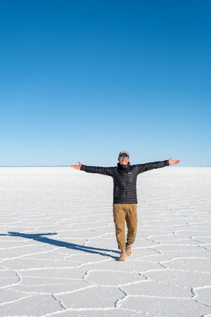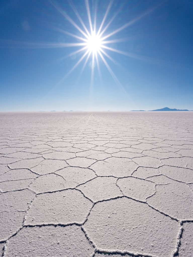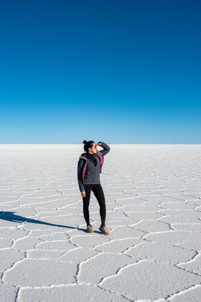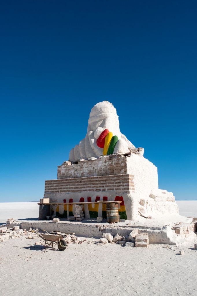 Le Salar est magnifique : le sol est entièrement blanc, et l’évaporation de l’eau crée des formes hexagonales dans le sel. En saison des pluies, le Salar est entièrement inondé et sa surface est comme un miroir géant, le spectacle doit être incroyable. En saison sèche comme maintenant, le contraste entre la croûte de sel blanche et le ciel bleu est saisissant !