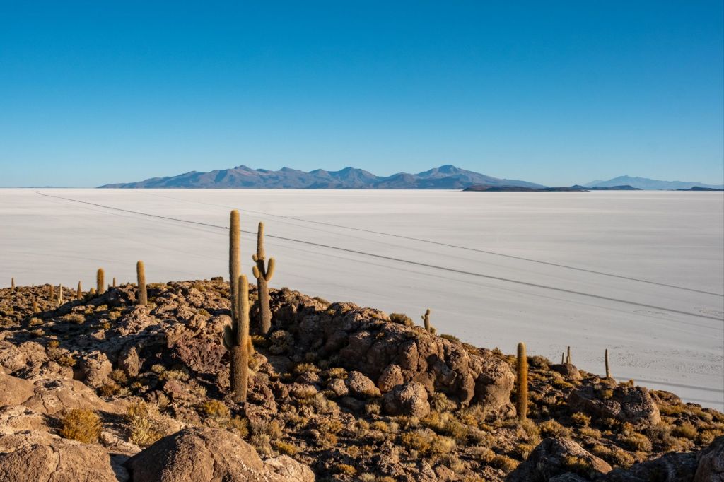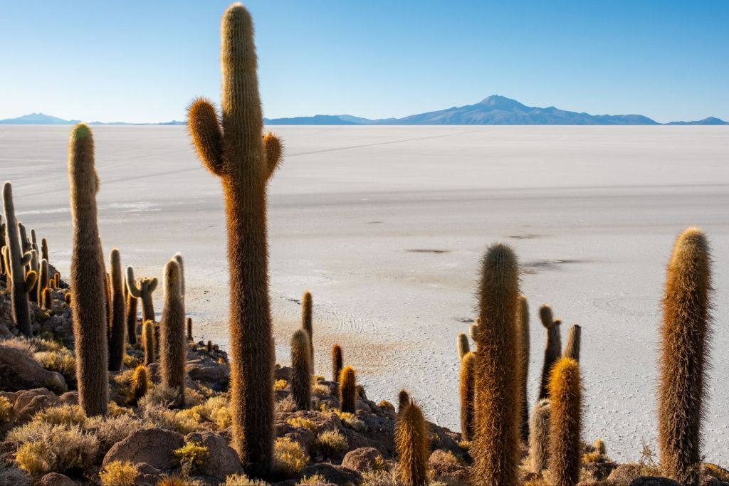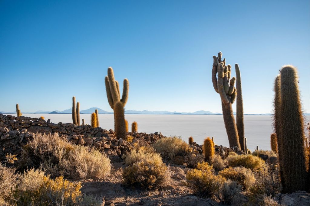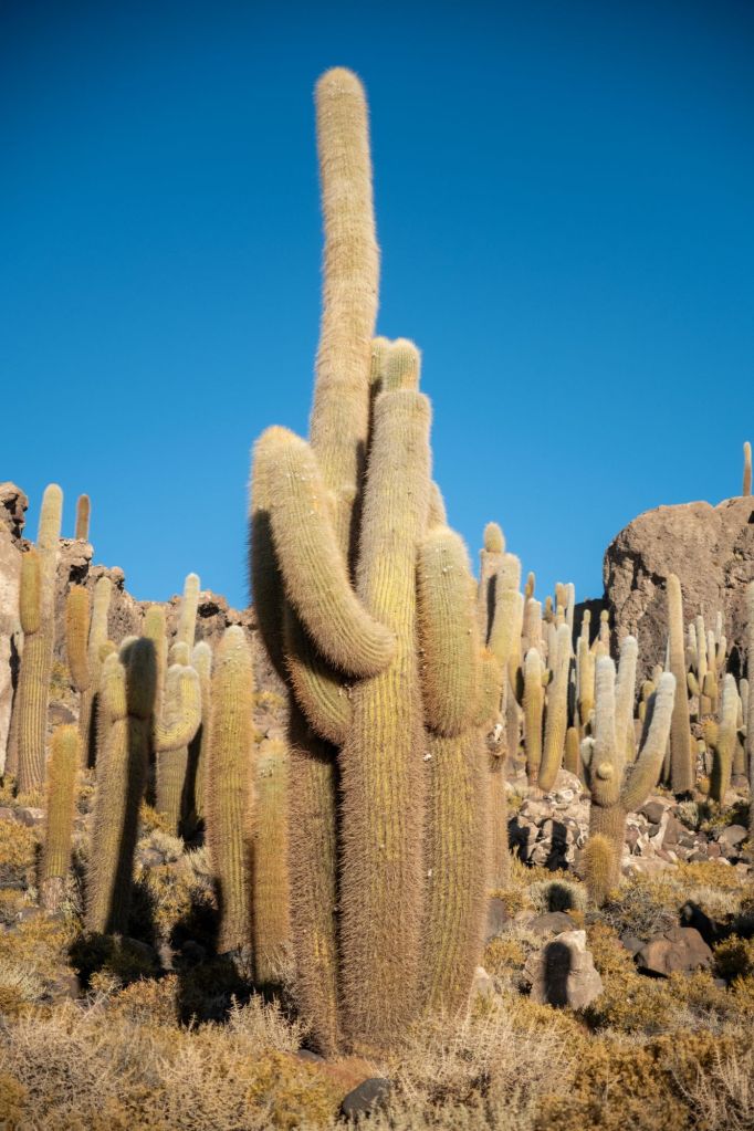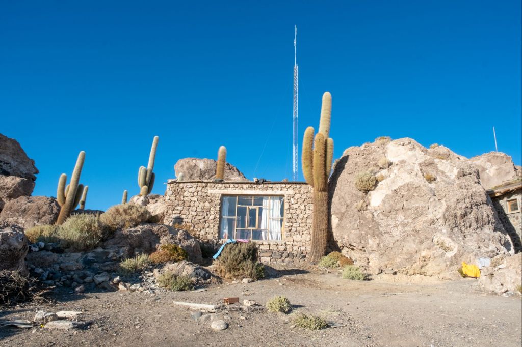 Notre prochain arrêt est l’Isla Incahuasi. C’est une île corallienne située au beau milieu du Salar, sur laquelle des centaines de cactus millénaires poussent. C’est tout à fait étonnant, et très photogénique dans la lumière du soir. Les quelques petites maisons des locaux sont construites en corail pour les murs et en bois de cactus pour les portes !