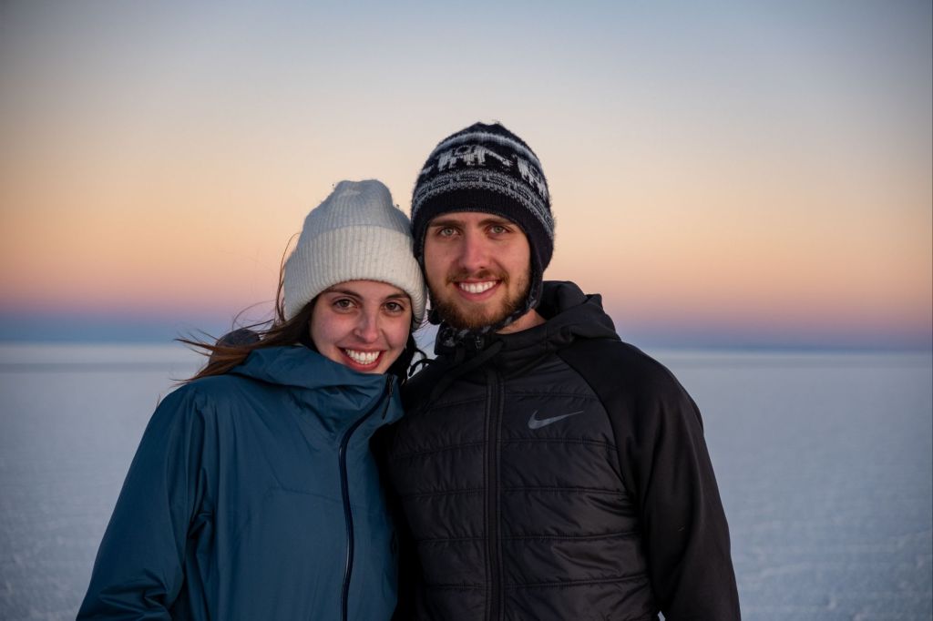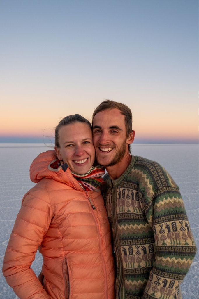 Nous nous levons aux aurores pour pouvoir admirer le lever de soleil sur le Salar. Les couleurs sont plus pastels qu’au coucher, c’est tout aussi beau et il fait tout aussi froid !