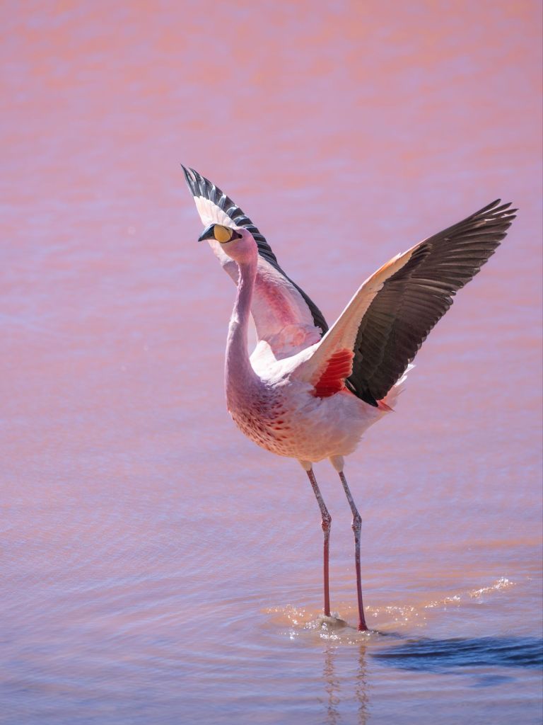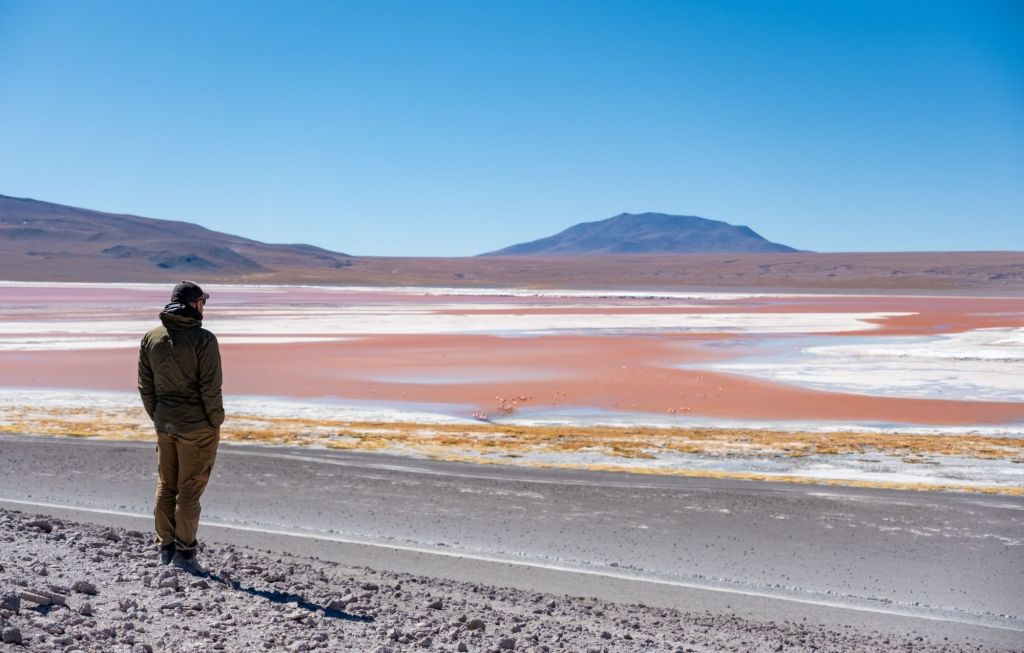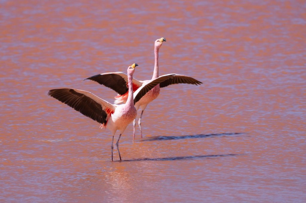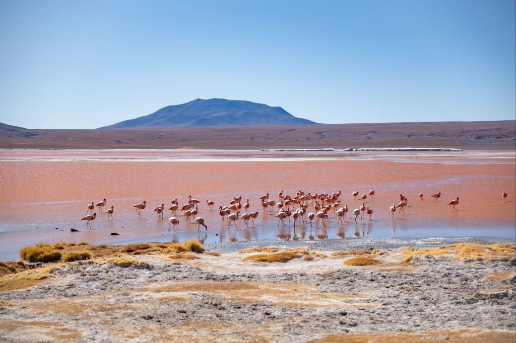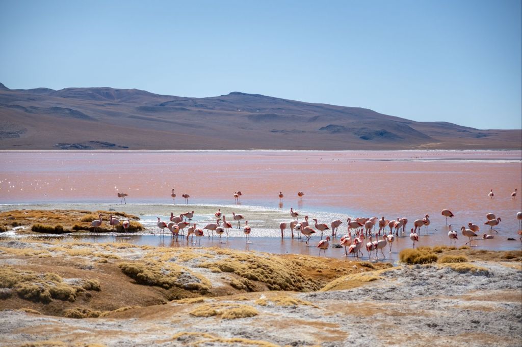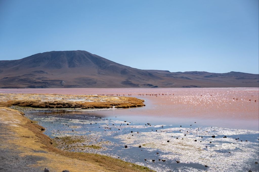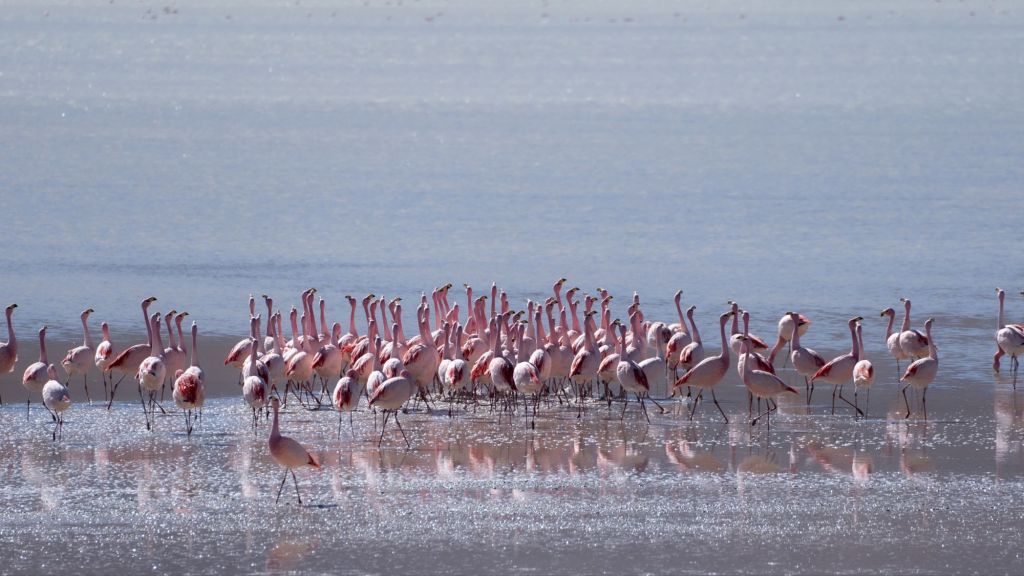Nous profitons d’une petite grasse matinée ce matin, et retournons à la Laguna Colorada pour la matinée. Cette fois elle a complètement changé de couleur, et son eau est d’un magnifique rose ! De nombreux flamands roses s’y baignent, ton sur ton. Nous sommes un peu frustrés de ne pas avoir de zoom suffisant pour les photos d’animaux, mais Antoine nous a gentiment transmis ses plus beaux clichés !