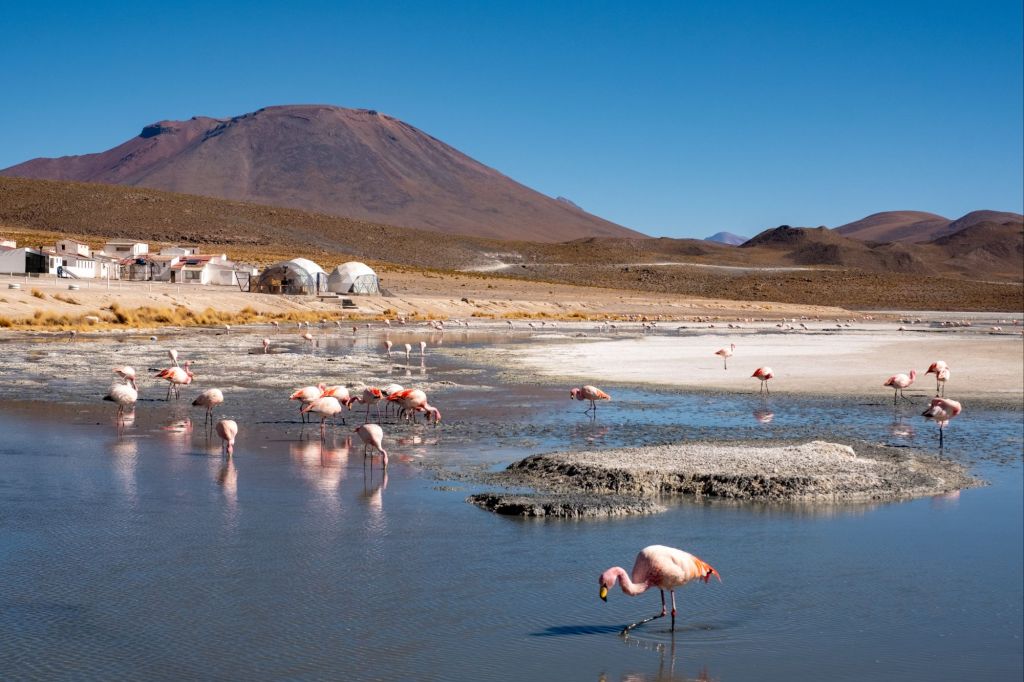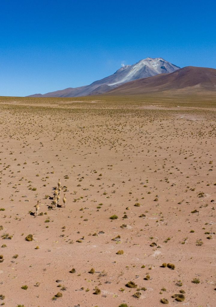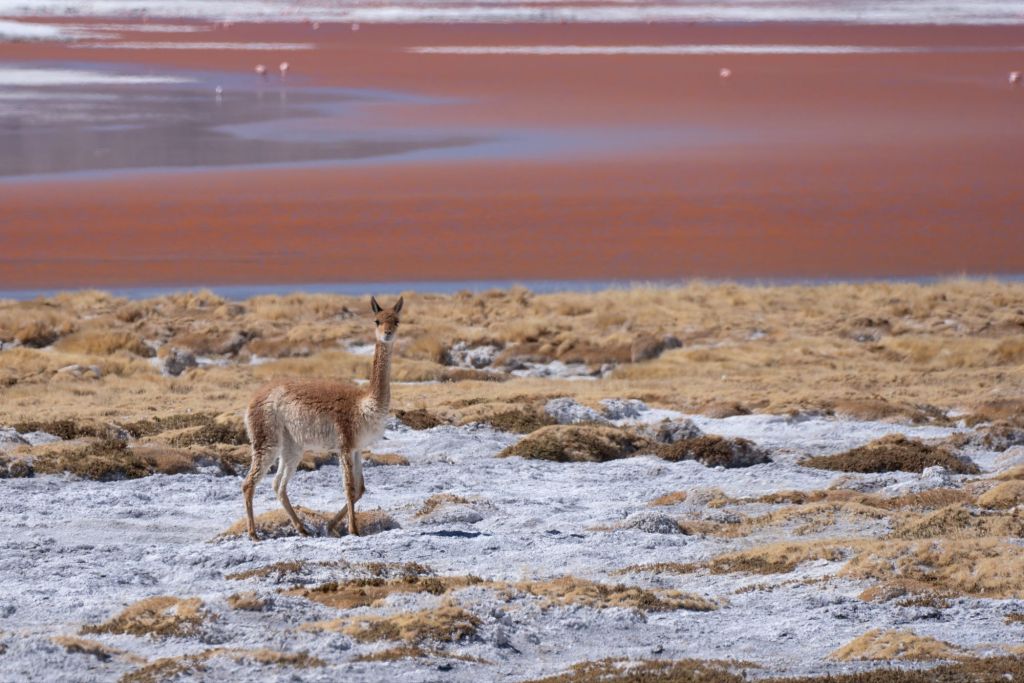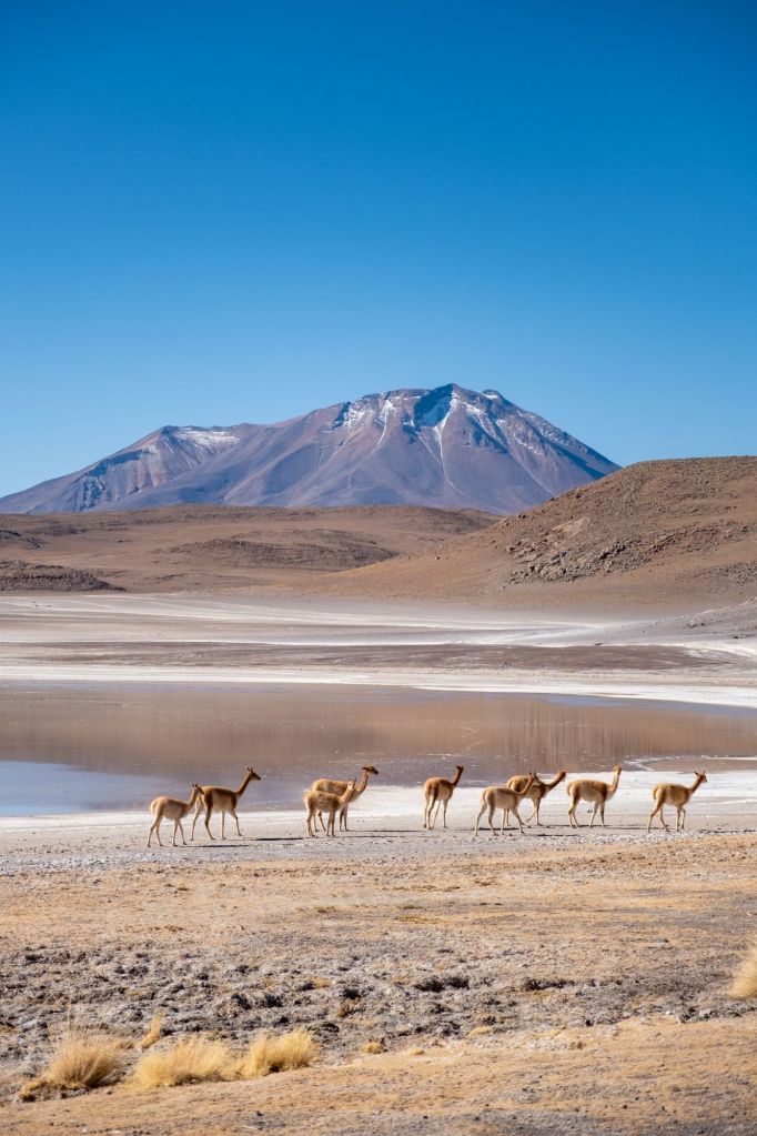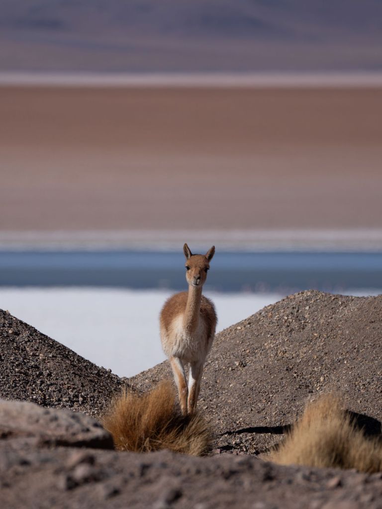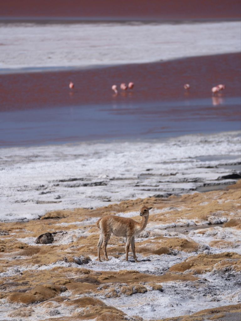 Nous déjeunons ici, sous un grand dôme vitré avec la magnifique vue. Nous continuons le long de la frontière chilienne pour arriver à la Laguna Cañapa, où nous avons pu admirer de nombreux flamands roses, typiques de la région. Nous croisons aussi nos premiers vicuña (vigognes), qui sont des cousins du lama et qui ressemblent à des biches.