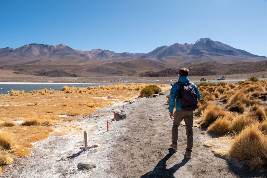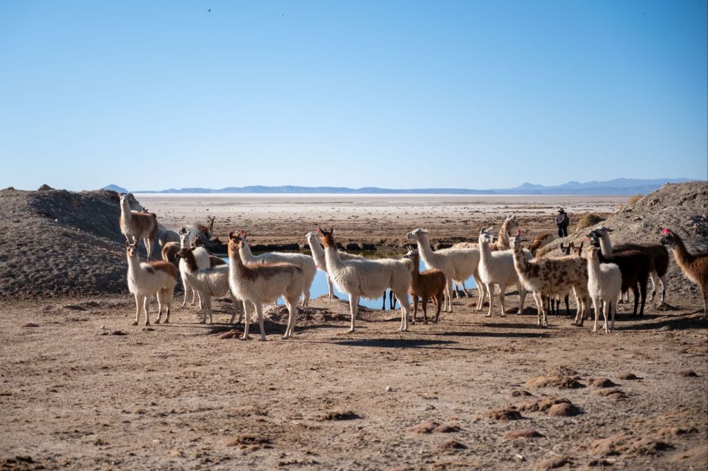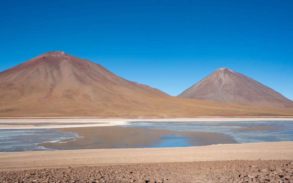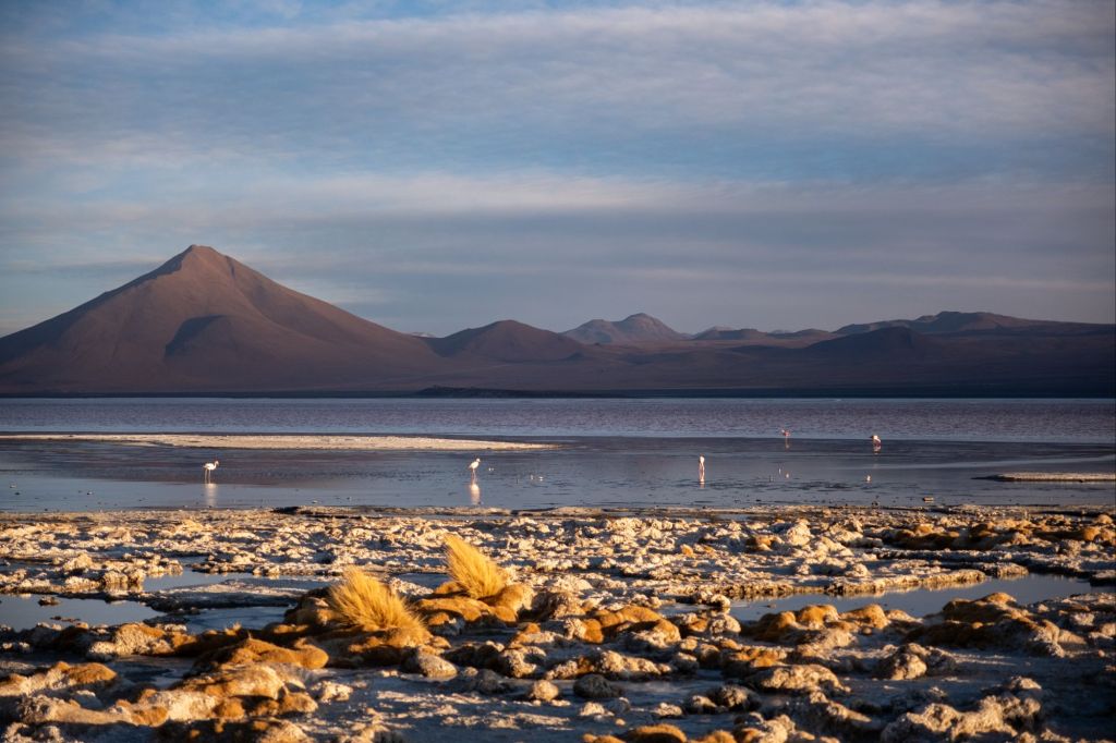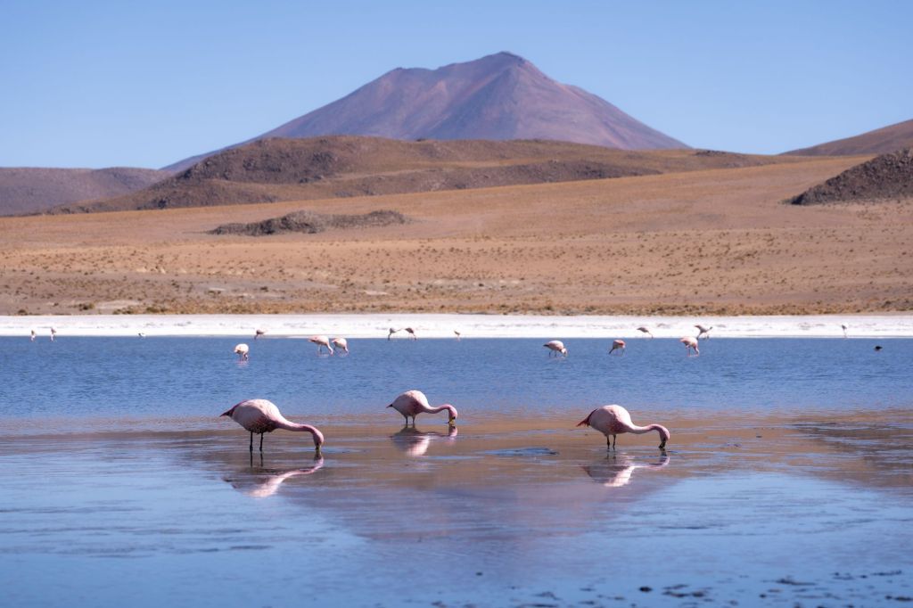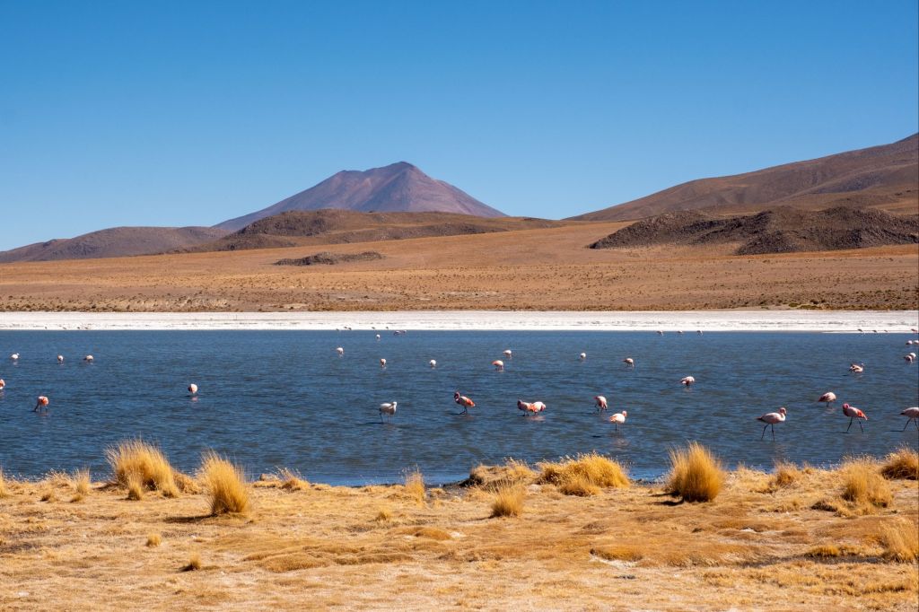 Nous déjeunons ici, sous un grand dôme vitré avec la magnifique vue. Nous continuons le long de la frontière chilienne pour arriver à la Laguna Cañapa, où nous avons pu admirer de nombreux flamands roses, typiques de la région. Nous croisons aussi nos premiers vicuña (vigognes), qui sont des cousins du lama et qui ressemblent à des biches.