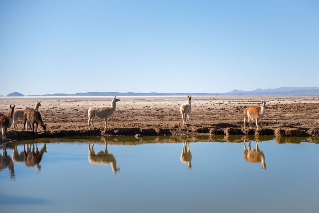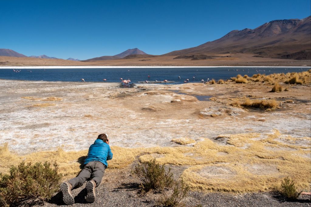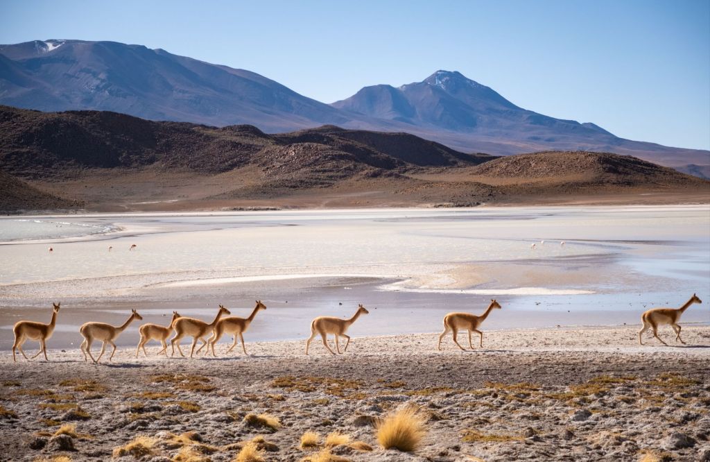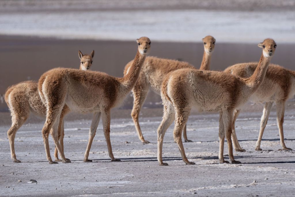 Pour bien terminer la matinée, des vicuñas prennent la pose au bord de l’eau, pour le plus grand bonheur d’Antoine et de Guillaume !