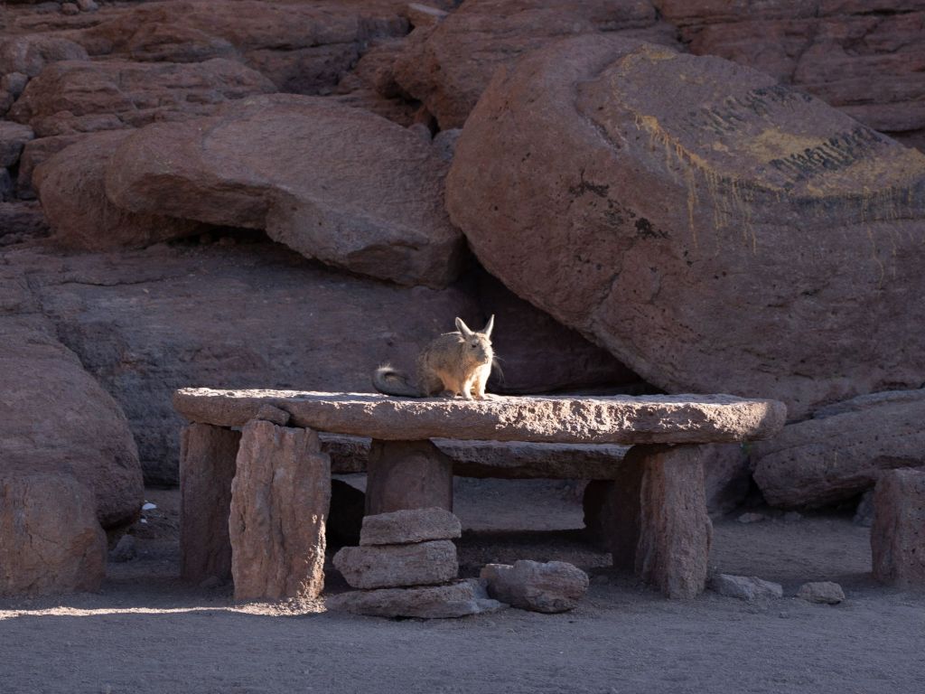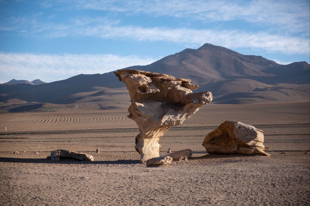 Après un bon petit-déjeuner buffet à notre hôtel, nous partons pour nos 4 jours d’exploration du Sud Lipez et du Salar d’Uyuni, accompagnés de notre guide Nico. Nous sommes un groupe de 6 : un couple de pharmaciens québécois, Marco et Sophie, et un couple de médecins français, Antoine et Laurie. Nous roulons d’abord en direction d’Uyuni, et nous nous arrêtons au bord de la route admirer une formation rocheuse tout à fait suggestive. Les paysages sont désertiques, les roches rouges et la végétation absente.