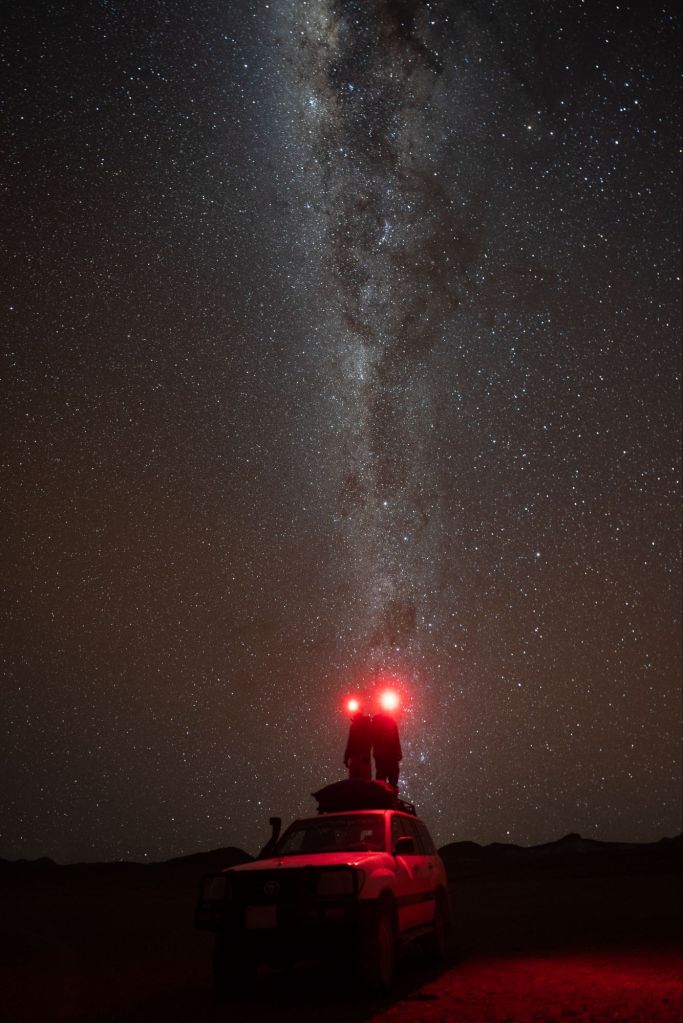 Ce soir, notre hôtel est un peu plus spartiate : pas de douche et seulement un peu d’électricité le soir, tant que le générateur est allumé. Nous dînons d’un pique macho, et Nico nous emmène admirer les étoiles, à l’écart de toute pollution lumineuse. Le ciel est incroyable, il y a tellement plus d’étoiles visibles que chez nous en Europe, et la Voie lactée est magnifique ! Antoine, passionné de photo, nous fait un petit shooting avec son super matériel, et le résultat est digne d’un professionnel !