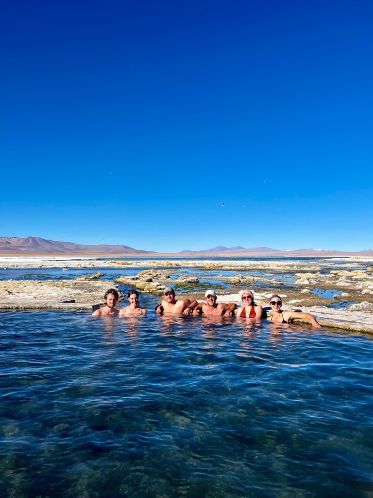 Nous arrivons dans l’après-midi aux bains chauds de la Laguna Chalviri. Nous posons nos affaires dans l’hôtel, qui a vue sur la lagune, enfilons nos maillots et allons nous baigner, malgré le froid extérieur ! La température des bains est parfaite, nous y restons plusieurs heures jusqu’au coucher du soleil. La sortie des bains dans la nuit est moins drôle et nous remontons vite à l’hôtel nous réchauffer avec un maté. Ce soir, nous avons droit à une bouteille de vin pour accompagner notre repas, c’est la fête !