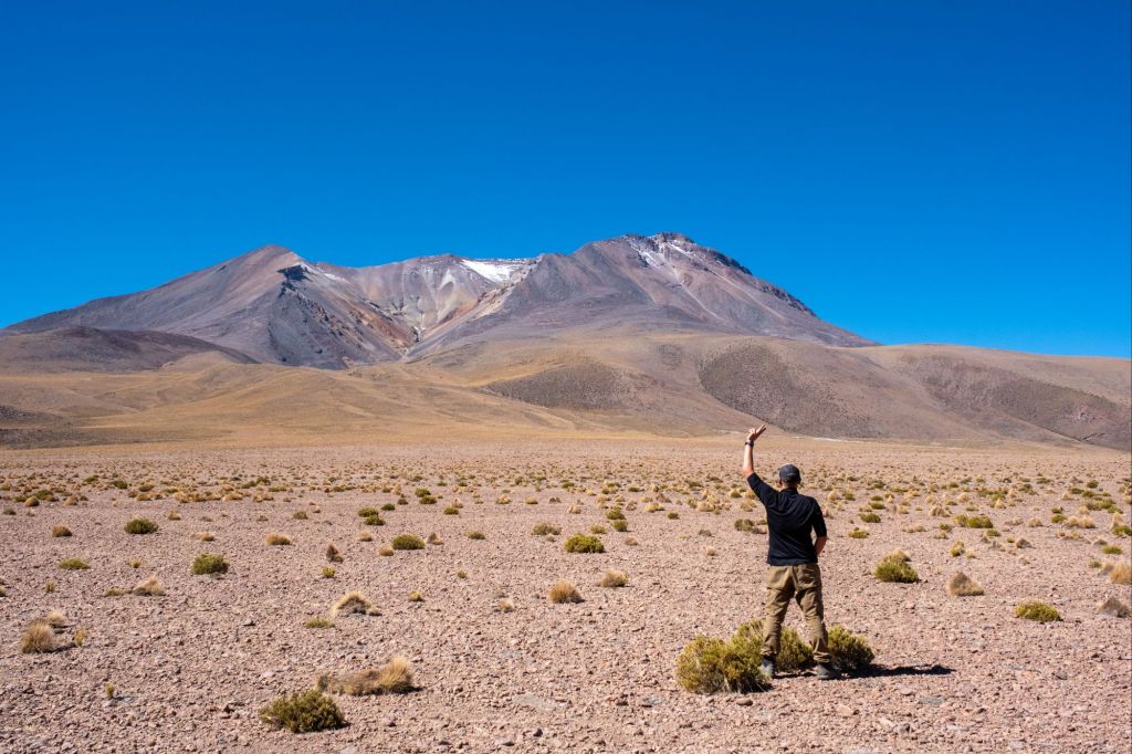 Nous sortons du Salar et poursuivons notre route dans des paysages toujours plus désertiques. La roche devient orange et la végétation rare. Nous nous arrêtons à un mirador avec vue sur le volcan Ollague. Le paysage est magnifique : nous marchons sur des coulées de lave ocres, et les pierres sont parfois recouvertes de minuscules plantes grasses.