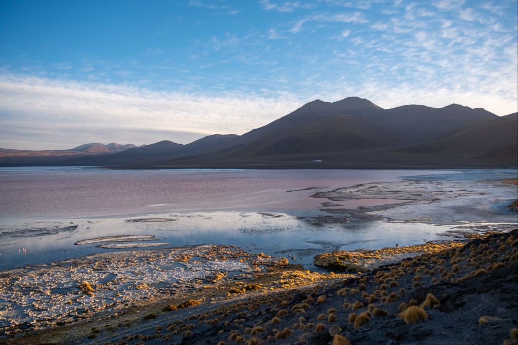 Nous arrivons en fin de journée à la Laguna Colorada et ses nombreux flamands roses. Son eau est violette à cette heure de la journée.