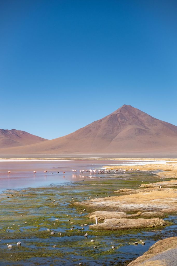Les couleurs sont encore une fois magiques : l’eau rose avec des îlots de sel blanc, les algues vertes au bord et les herbes jaunies sur la rive, sans oublier les montagnes oranges en arrière plan.