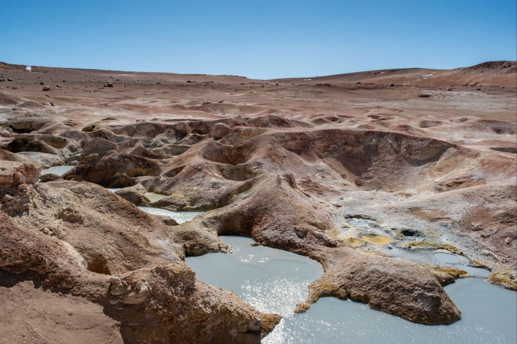 Après le déjeuner à l’hôtel, nous allons voir les geysers Sol de Mañana. Comme leur nom l’indique, ils doivent être plus actifs le matin, mais nous pouvons quand même voir de belles volutes de vapeur.