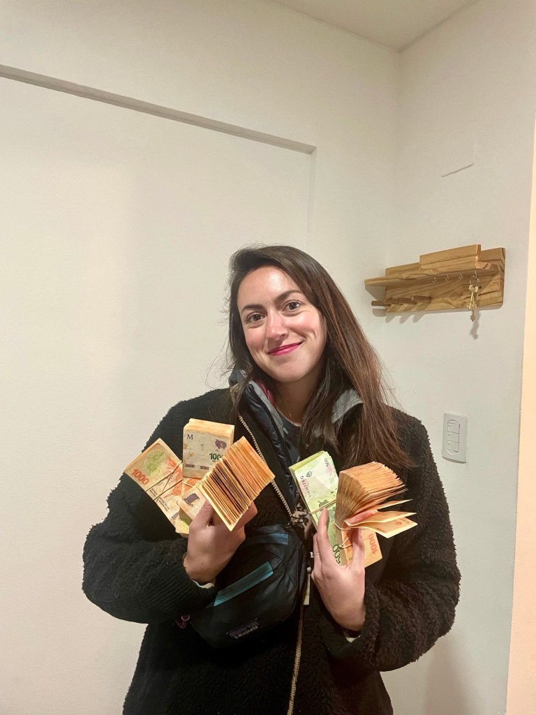 Notre première journée en Argentine nous permet d’organiser la suite du voyage : recherche de bonnes adresses, réservations diverses, et tenter de trouver des pesos argentins. Avec la dévaluation de la monnaie actuelle, il existe un taux parallèle (le taux blue), qui permet aux personnes utilisant des devises étrangères d’obtenir un bien meilleur taux qu’en retirant de l’argent à la banque. Plein de gens, dans la rue, proposent du change. Nous suivons un monsieur qui nous emmène à l’arrière d’une boutique, où un petit bureau de change clandestin est installé. Nous échangeons 300€, et on nous donne environ 400.000 pesos en billets de 500 et de 1000, on a l’impression d’avoir braqué une banque !
