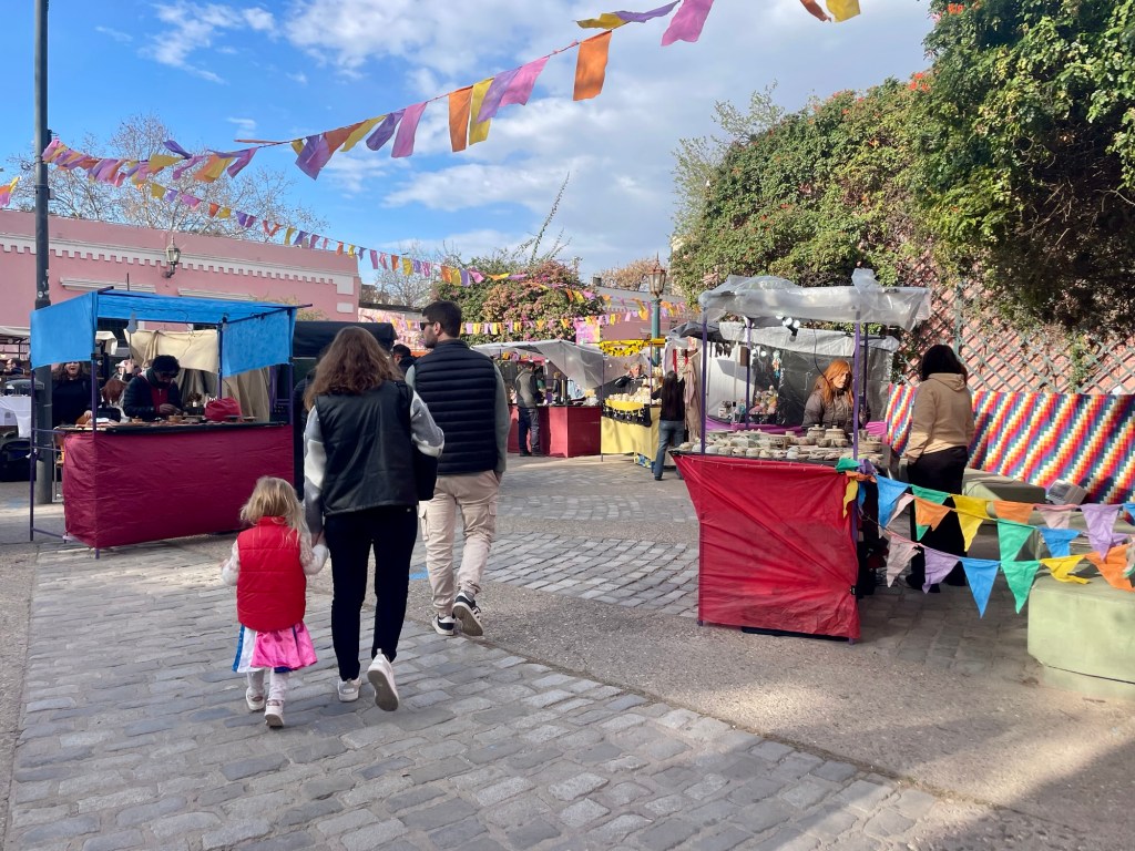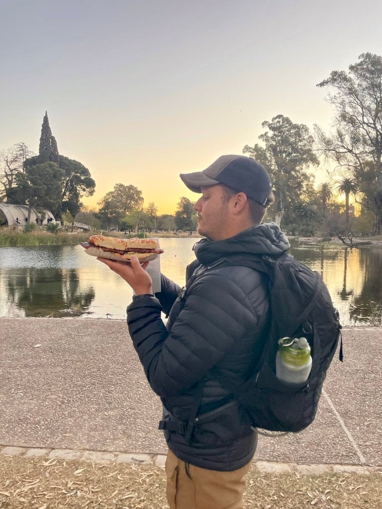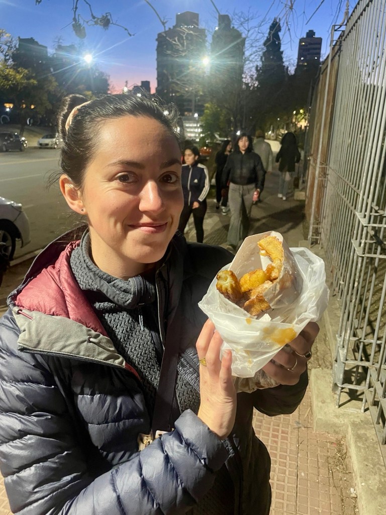 Nous nous promenons ensuite dans le grand parc Sarmiento, où des familles entières viennent passer le dimanche soir, entre piques-niques dans l’herbe et spectacles de clowns. Nous dînons sur le pouce dans les food trucks du coin : choripan (sandwich de saucisse grillée au barbecue) et churros au dulche de leche.