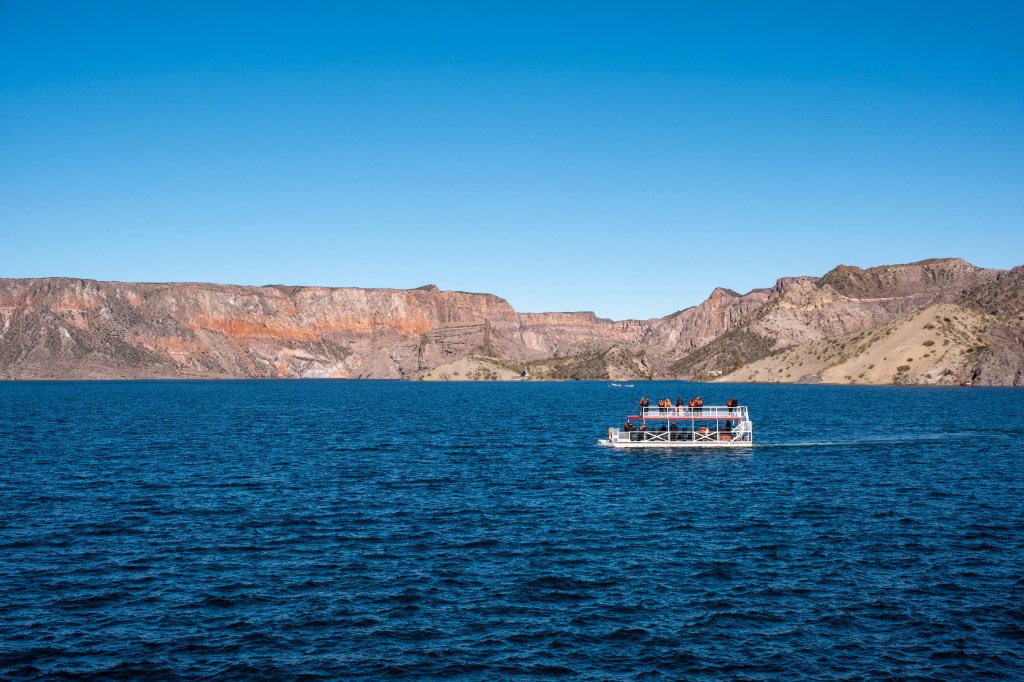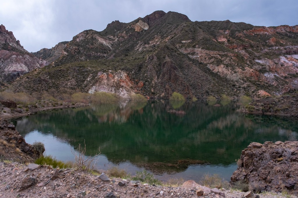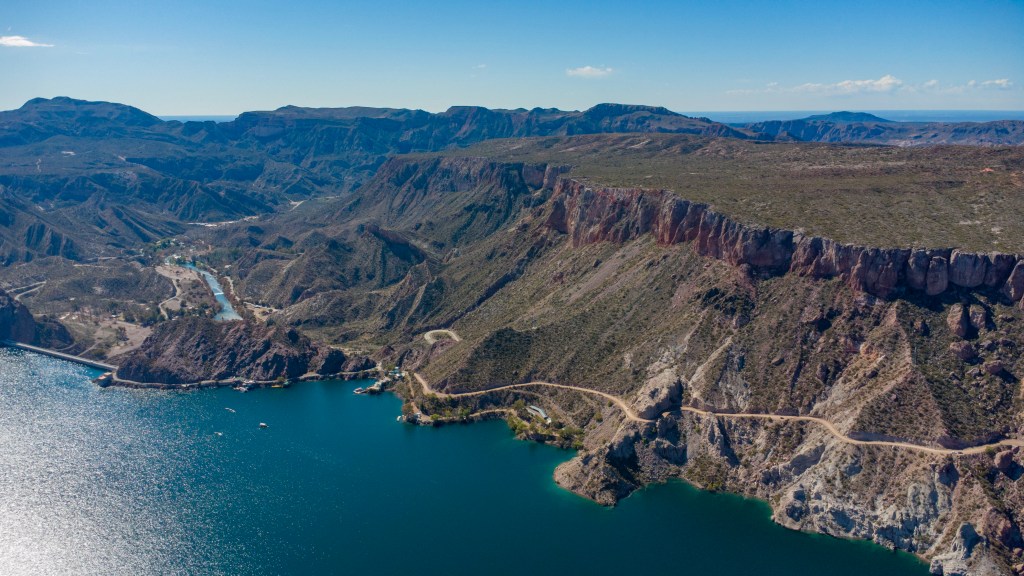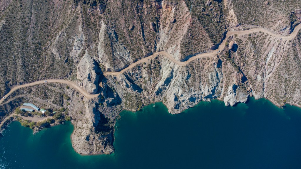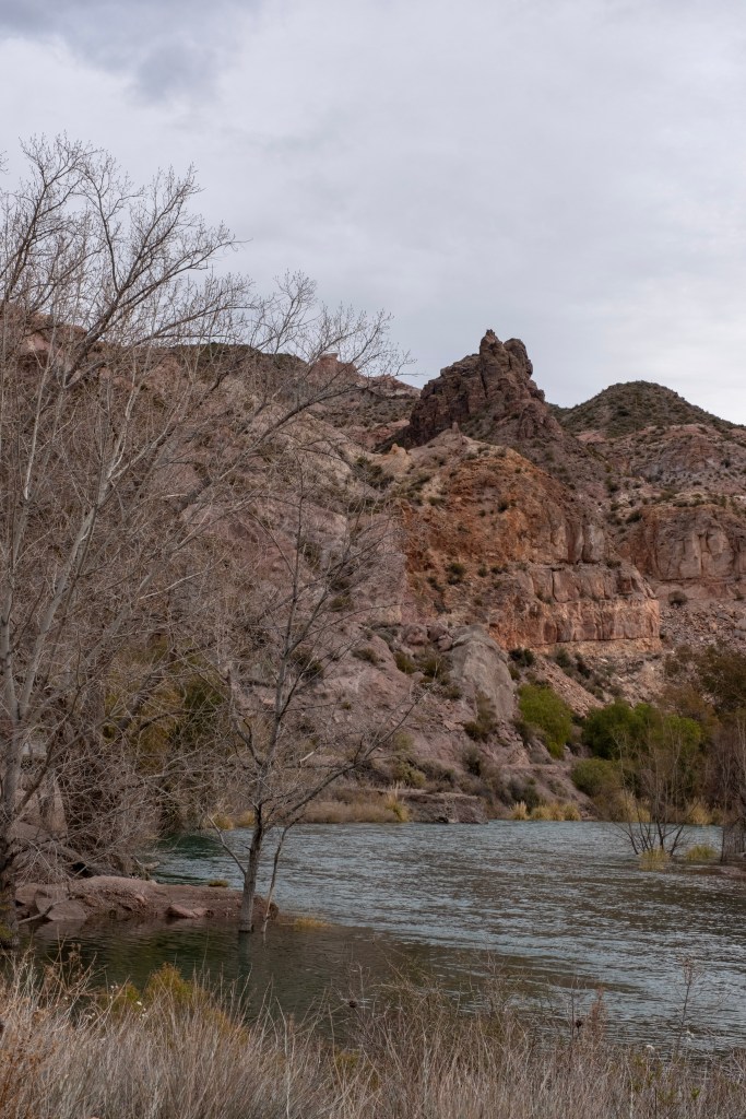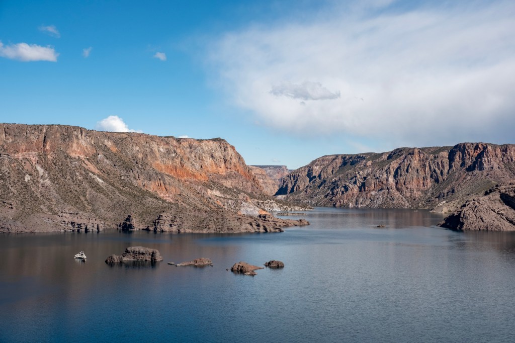 Nous arrivons rapidement au pied d’un grand barrage, et son magnifique lac de retenue, au milieu du canyon. Le paysage est sublime, avec le canyon coloré rempli d’eau. Nous en profitons pour pique-niquer face a cette belle vue.