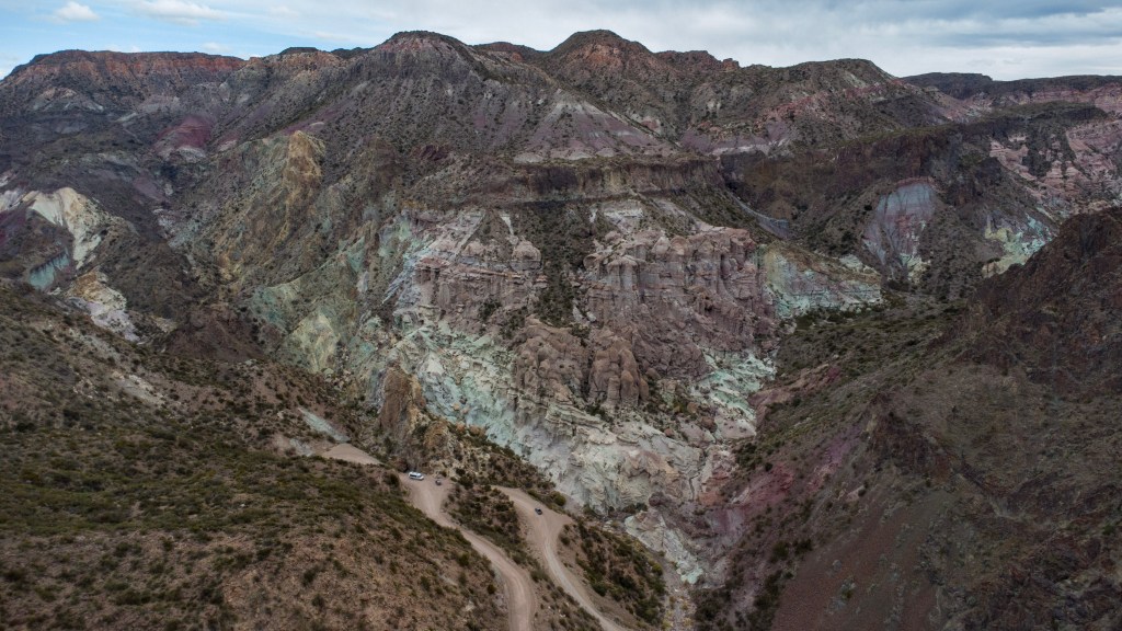 La vallée suivante est magnifique : la rivière bleue serpente au fond, et les falaises sont tantôt rouges/roses, tantôt bleues/vertes. C’est la plus impressionnante, les couleurs sont incroyables.