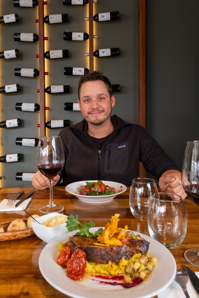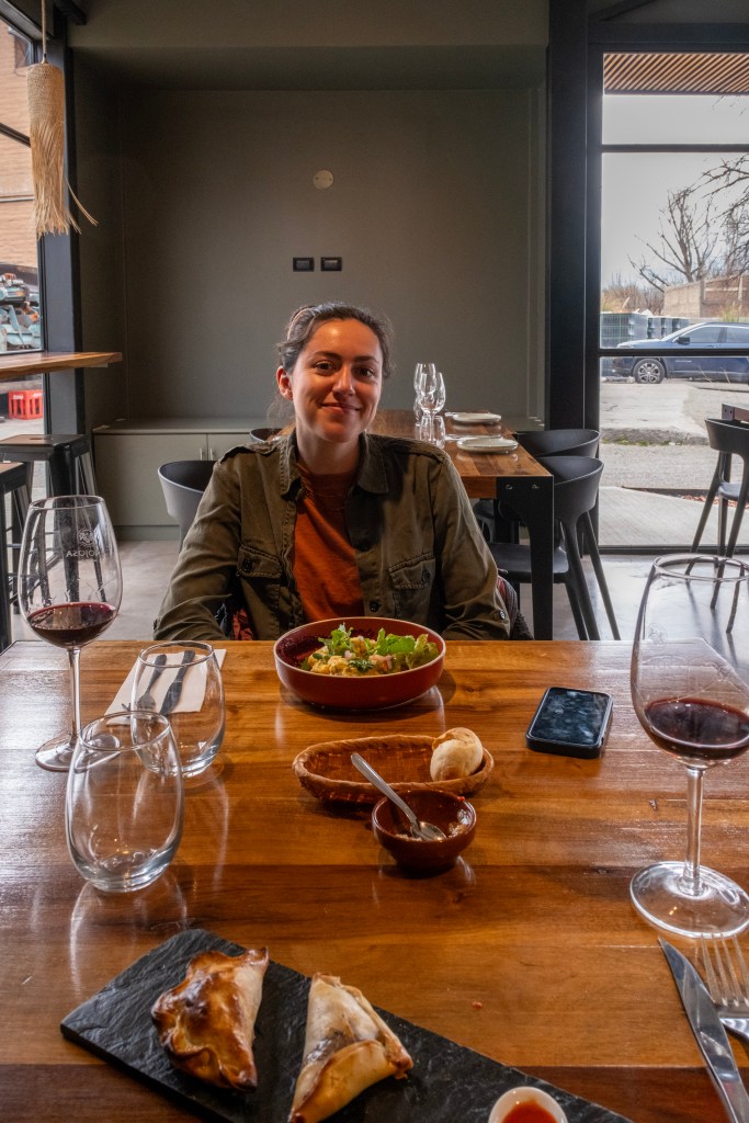 Après un petit brunch à l’appartement, nous récupérons notre voiture de location pour les prochains jours et nous nous dirigeons vers la Valle de Uco, au sud de Mendoza. La région est connue pour ses nombreux vignobles, et nous allons justement visiter une des exploitations : la Bodega Hinojosa. Nous commençons par le déjeuner avec accord mets-vins : empañadas et tempura de brocolis en entrée, raviolis à l’agneau et pièce de porc en plat principal, et un étonnant cheesecake à la betterave en dessert !