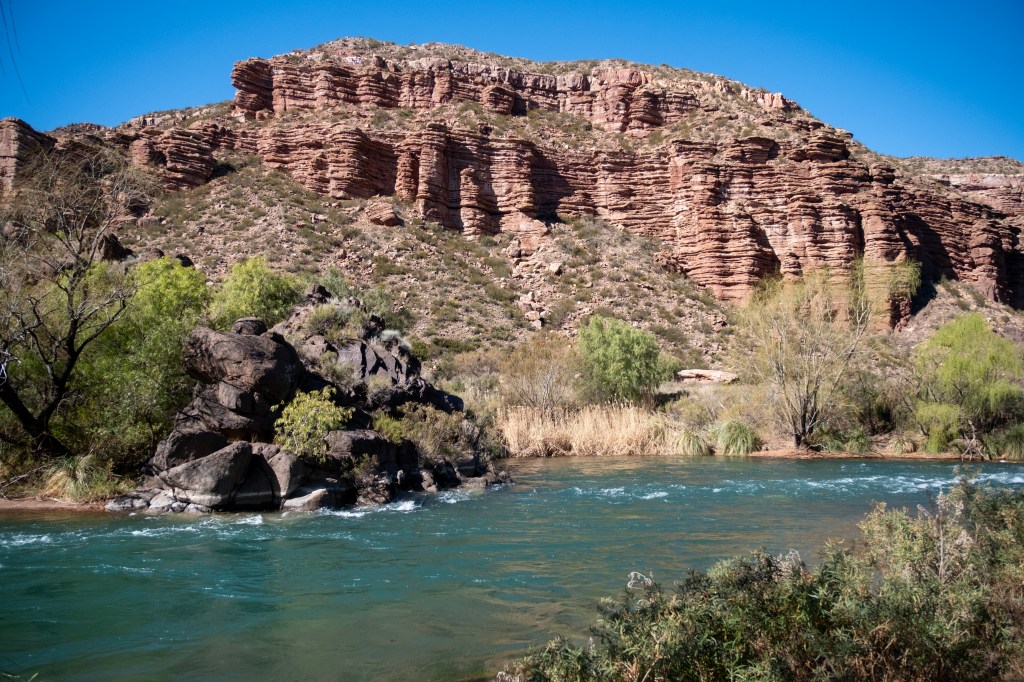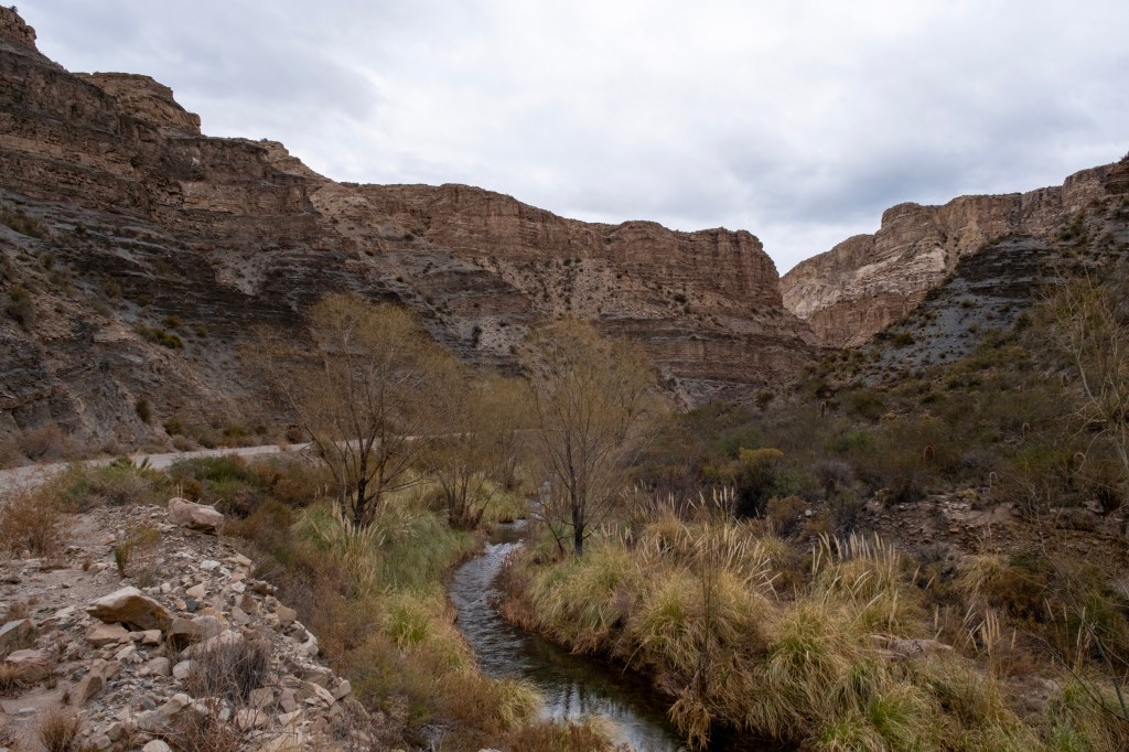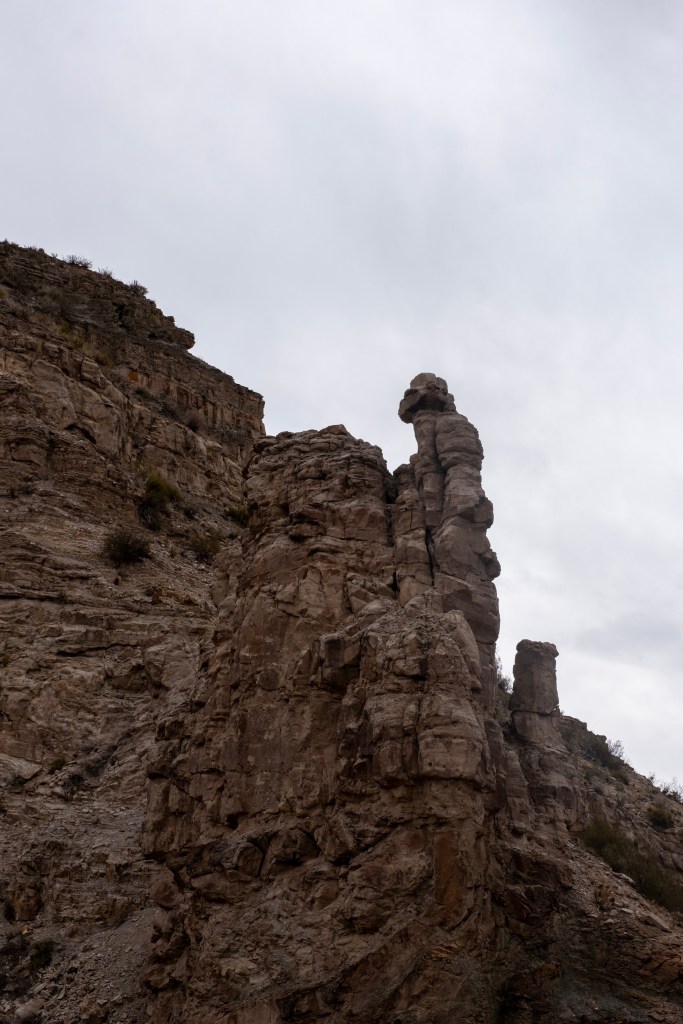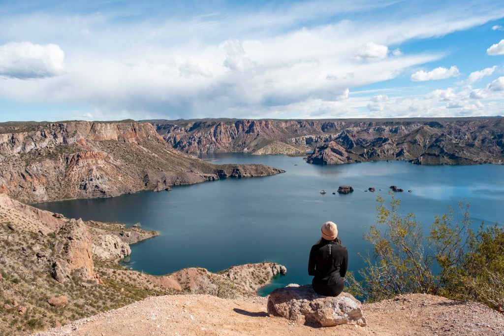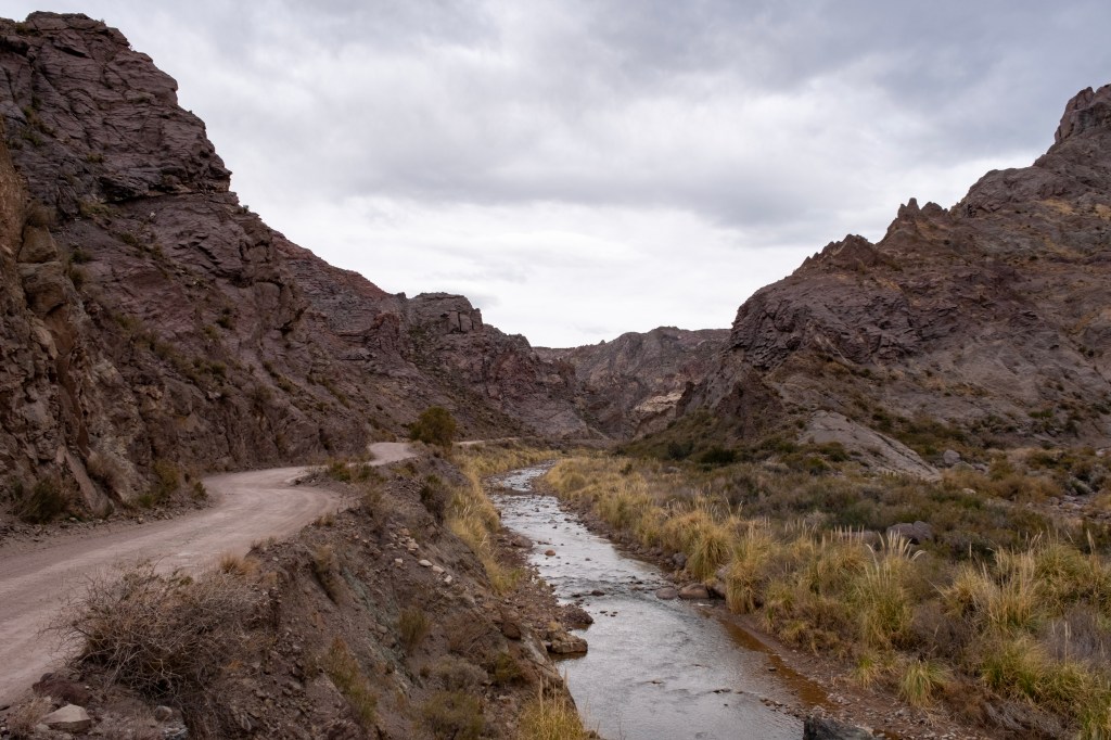 Ce matin, nous passons à San Rafael acheter notre pique-nique du midi, puis nous roulons en direction du Cañon del Atuel. Le début de la route suit le Río Atuel, une jolie rivière à l’eau bleue dans laquelle le rafting a l’air largement pratiqué en été.