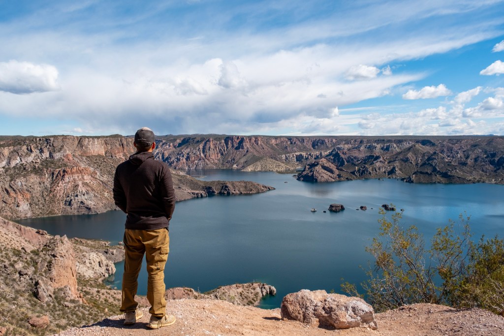 Puis la route monte et nous permet d’avoir une vue en hauteur sur ce beau lac. Nous trouvons un petit stand de souvenirs au bord de la route, et Guillaume achète quelques couteaux à viande argentins, ainsi qu’un délicieux lomo (charcuterie de filet mignon de porc mariné).