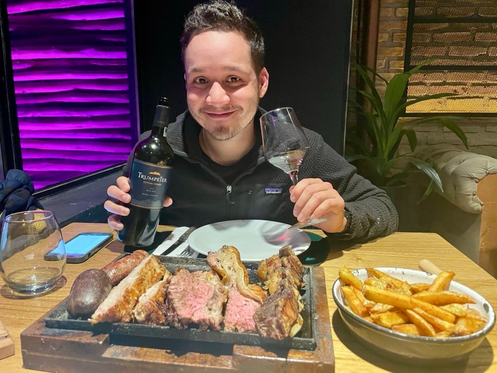 Nous allons récupérer notre linge à la laverie avant de sortir manger chez El Asadito, un restaurant de viande que Guillaume a repéré. Pour notre premier repas argentin, nous choisissons une parilla à partager. C’est un type de barbecue argentin avec différentes viandes, nous avons différentes coupes de bœuf, du porc, du chorizo et du boudin noir, le tout accompagné de frites et d’une bouteille de Malbec argentin. C’était absolument délicieux, nous nous sommes régalés !