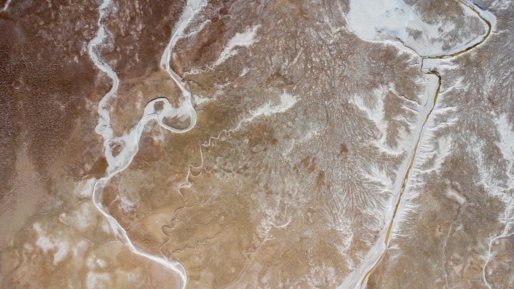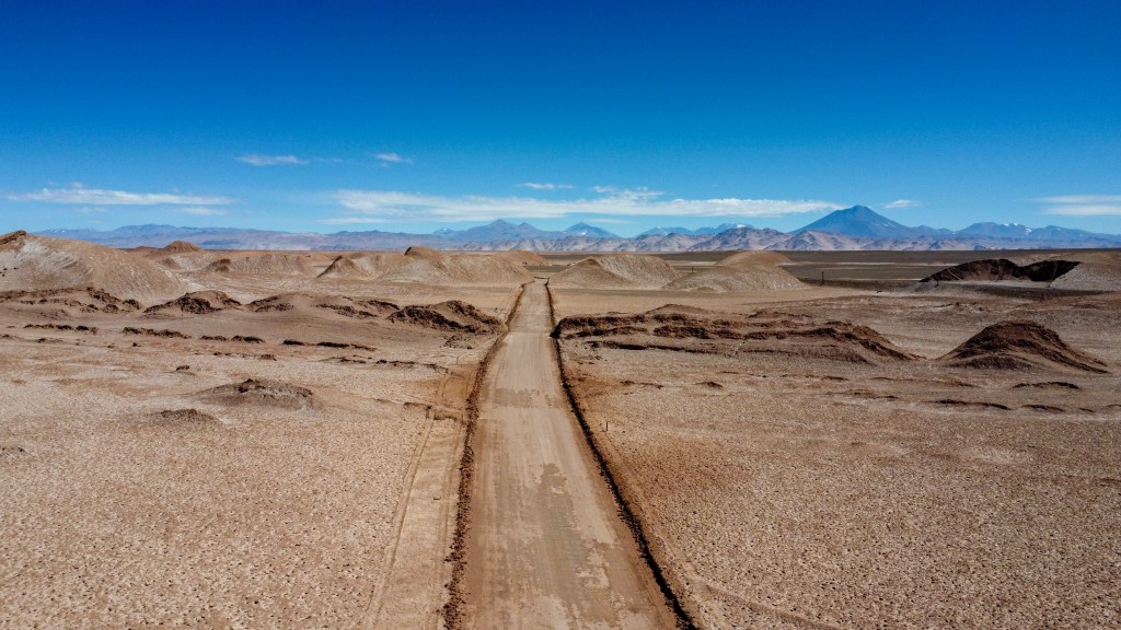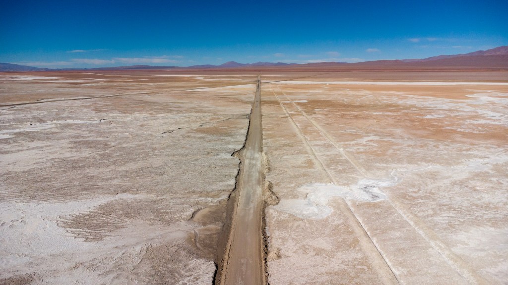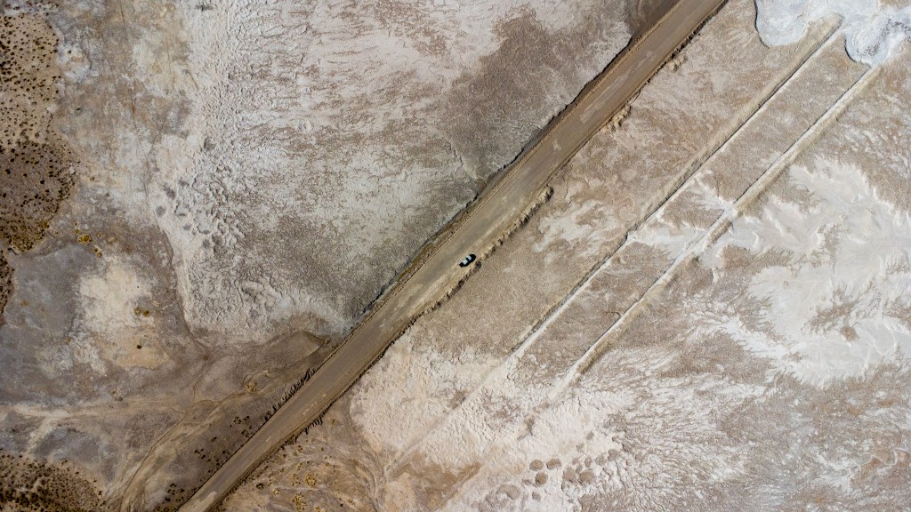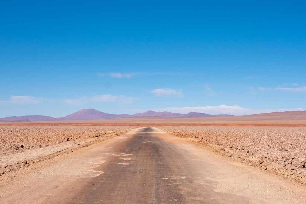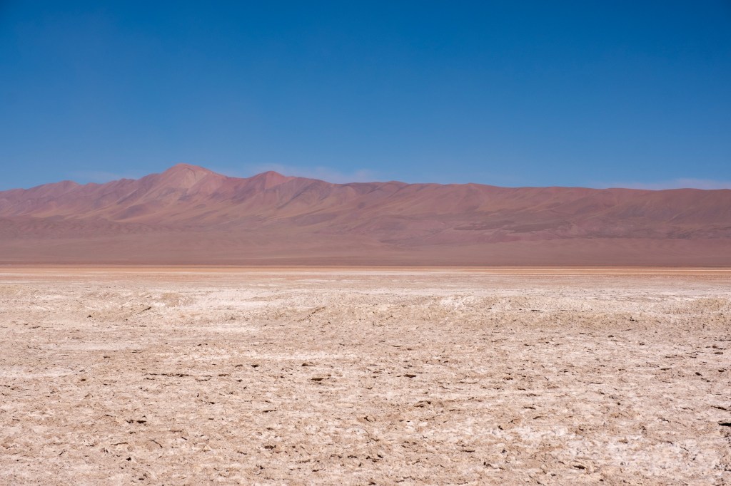 La piste se poursuit, plus ou moins cahoteuse, dans la poussière soulevée par les camions. Nous arrivons au Salar de Pocitos et sa grande étendue plane recouverte de blocs de terre brune saupoudrés de sel.