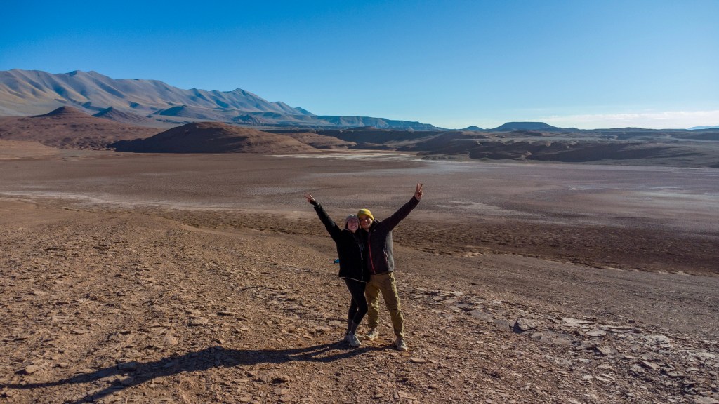 Nous partons au lever du soleil car une grosse journée de route nous attend. Nous partons pour 6h de piste pour Tolar Grande, petite ville au milieu du désert. Nous sortons de San Antonio quand le soleil se lève et éclaire doucement les collines recouvertes d’herbes séchées par le soleil. La piste de graviers grimpe jusqu’à passer un col à 4500m, puis redescend tranquillement.