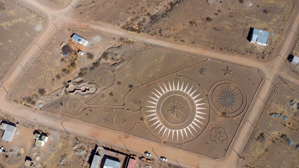 Après un petit déjeuner classique argentin à l’hôtel (pain, cream cheese et confiture), nous grimpons sur les hauteurs de la ville pour aller voir l’Ovniport. Dans le nord de l’Argentine, et surtout dans les régions désertiques, des Ovnis auraient été aperçus, et des marques étranges au sol seraient apparues. Ici c’est l’œuvre d’un artiste suisse, qui a dessiné des formes au sol, avec des cailloux, en référence à ces Ovnis.