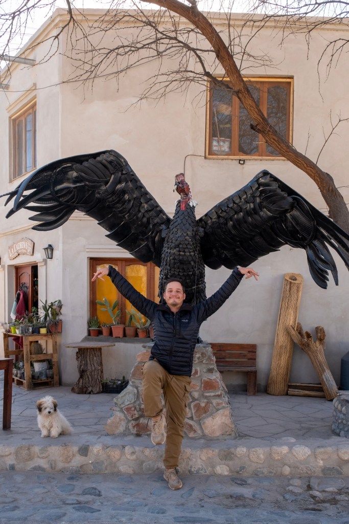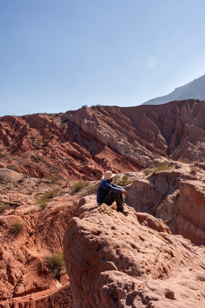 Nous nous arrêtons face au canyon pour manger nos sandwichs saucisson-fromage. Nous sommes ravis car la charcuterie et le fromage sont plutôt bons en Argentine ! Nous apercevons même un condor qui tournoie au-dessus de nous.