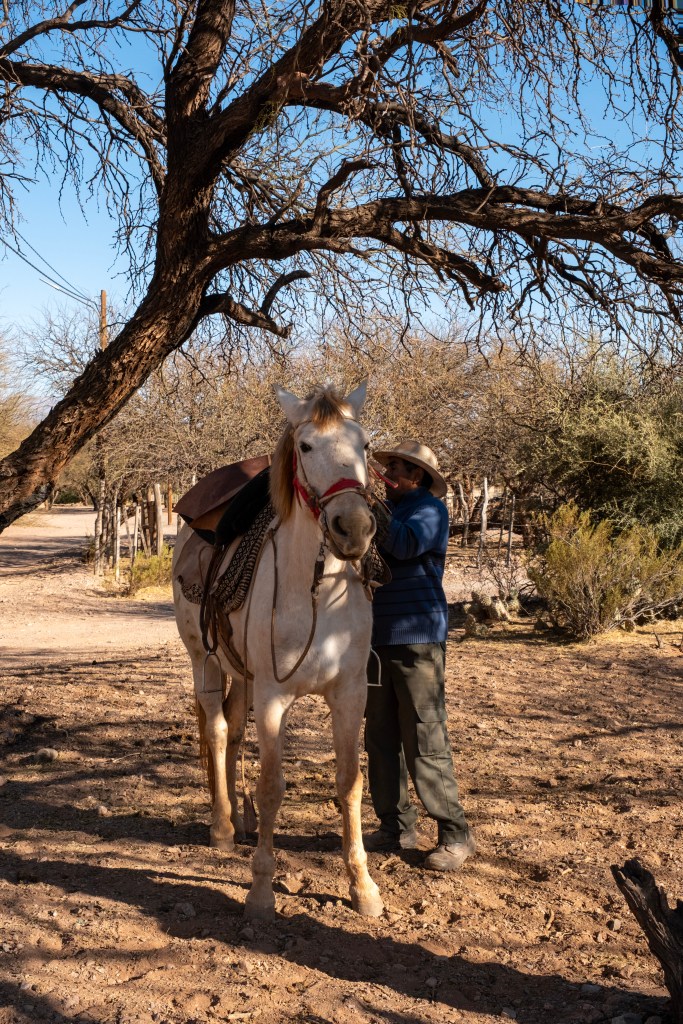 Ce matin nous avons rendez-vous avec Antonio, un agriculteur de la région qui organise des promenades à cheval. Nous partons pour 3h de balade sur nos jolis cheveux gris : Ringo et Paloma. Ils ont l’harnachement des chevaux du coin : filet et rênes en cuir tressé, selles rembourrées de coussins et étriers en cuir. Nous commençons par marcher dans le lit d’une rivière asséchée, dans lequel poussent quelques buissons épineux. Nos chevaux sont dynamiques et très heureux de galoper, on a du mal à les arrêter !