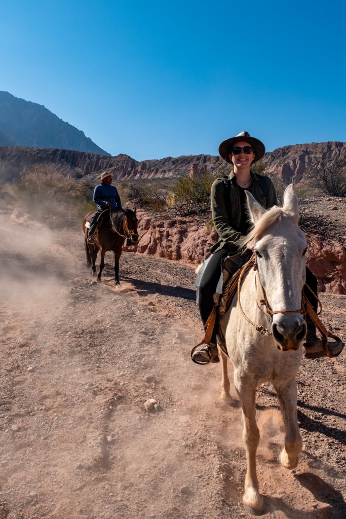 Nous arrivons au cœur d’un canyon de pierres oranges, le massif Los Colorados. C’est magnifique, nous descendons de cheval et allons nous promener au milieu des étroites falaises. Sur le chemin du retour, les chevaux sont très excités de rentrer au ranch et galopent de bon cœur.