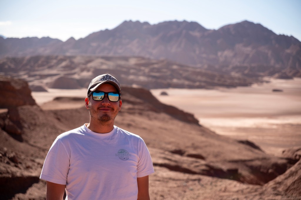 Nous continuons de rouler et arrivons au Desierto del Diablo. Tout est magnifique : la roche et le sable sont oranges, des petites montagnes en forme de cône se dressent partout autour de nous. Et au fond, une grande montagne multicolore, avec des tons de rouge, de vert, de jaune…