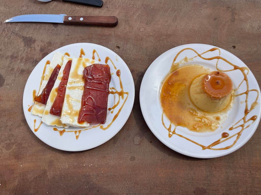 Nous rentrons à Cafayate et allons déjeuner à la Casa de las Empañadas, sur les conseils d’Antonio. Il y a une douzaine de parfums différents (viande et maïs, tomate et roquefort, jambon et fromage…), et tout est délicieux, ce sont de loin les meilleurs que nous ayons mangé pour l’instant ! Pour terminer, nous prenons des desserts typiques : queso con dulche de membrillo (fromage accompagné de pâte de coing), ainsi qu’un flan casero (flan à la vanille et au caramel).