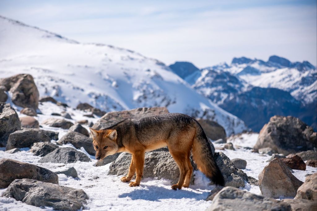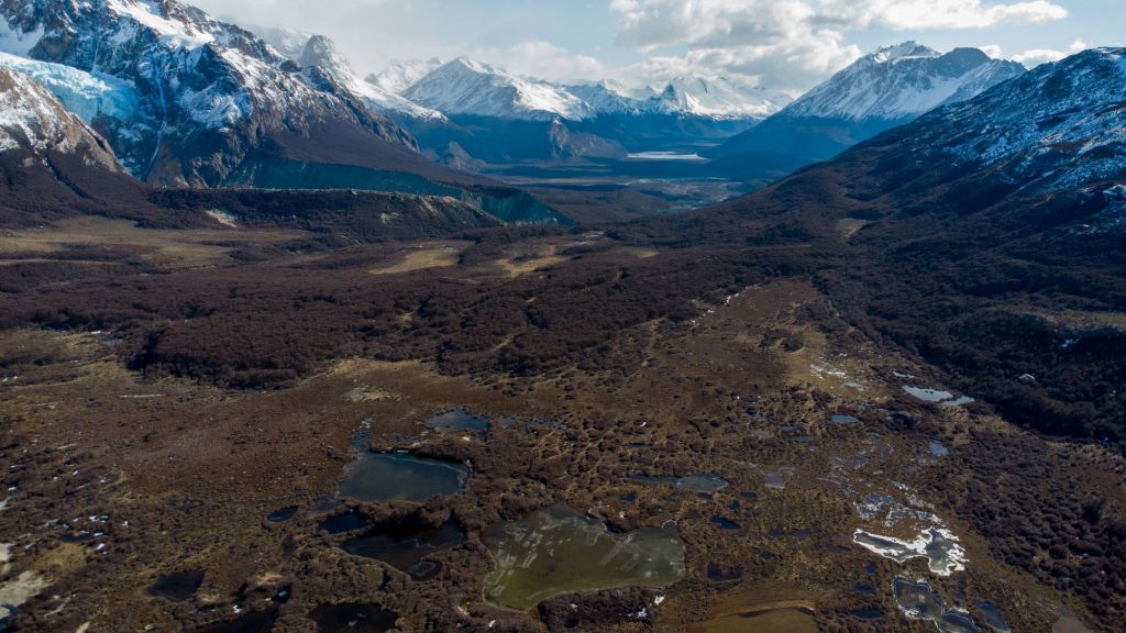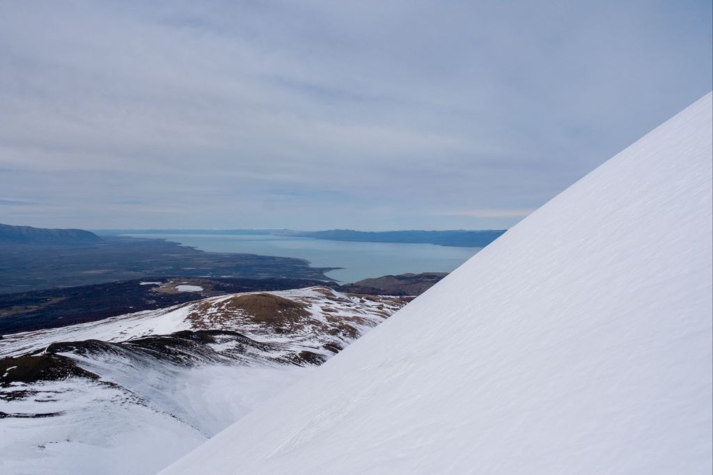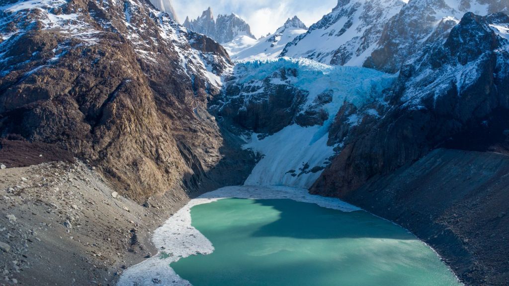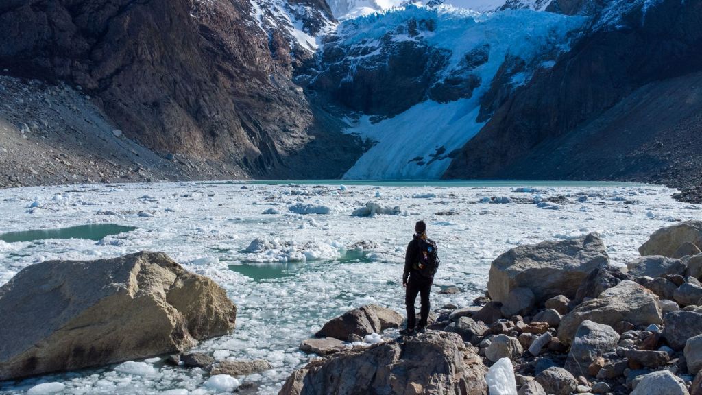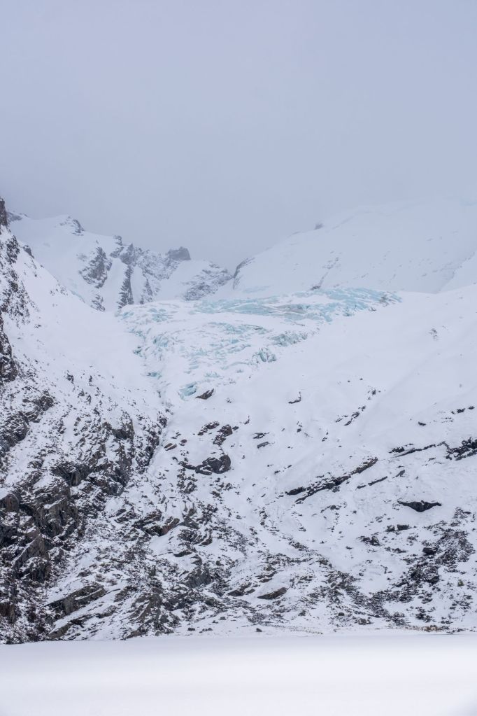 Nous redescendons prudemment dans la neige, et obliquons dans la vallée en direction du glacier Piedras Blancas. Nous suivons la rivière sur un chemin peu emprunté, et arrivons dans la vallée glaciaire, remplie d’énormes rochers tombés des flancs de la montagne. Nous grimpons au milieu de ce fatras de rochers et atteignons le grand lac gelé au pied du glacier. Il est très impressionnant avec sa couleur bleutée et son aspect hérissé.