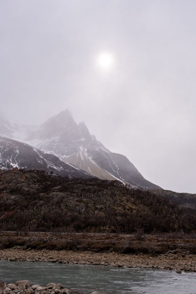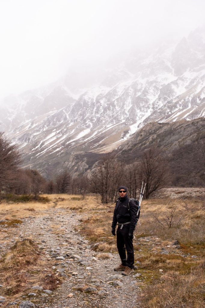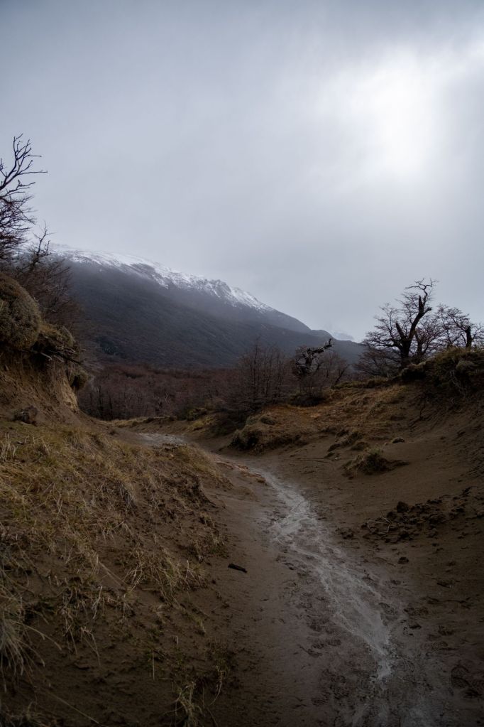 Il ne fait toujours pas très beau ce matin, mais nous prenons tout de même la navette pour aller au nord d’El Chalten, au Lago del Desierto. Après 1h30 de route, nous sommes déposés au pied du sentier pour aller voir le glacier Huemul. Nous grimpons le sentier enneigé sous une fine pluie qui se transforme en neige au fur et à mesure de notre montée.
