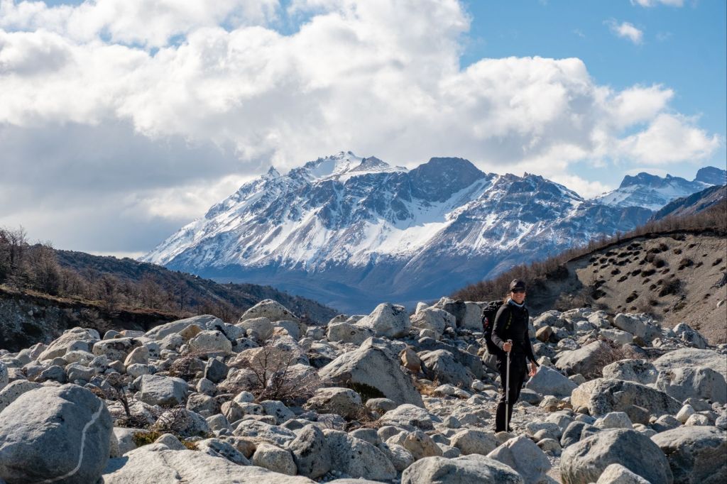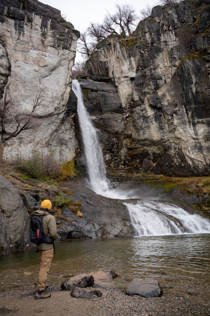 Après plusieurs kilomètres nous atteignons le mirador Piedras Blancas, avec une vue incroyable sur le glacier du même nom (celui où nous avons eu l’accident de drone). Le sentier est magnifique et la vue sur le glacier se prolonge, pour notre plus grand plaisir.