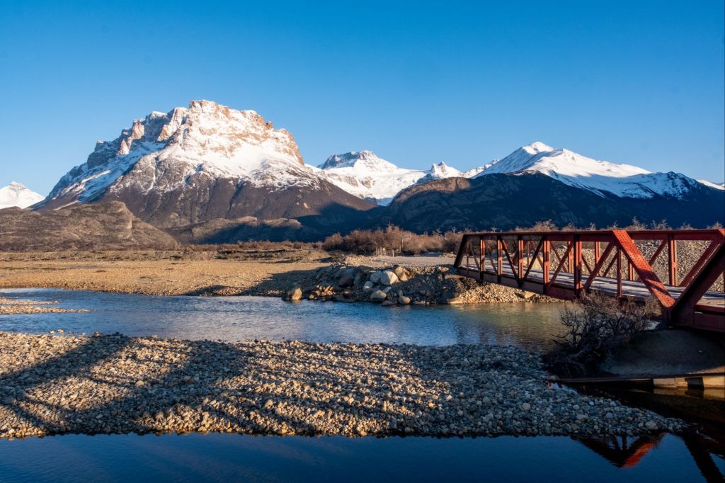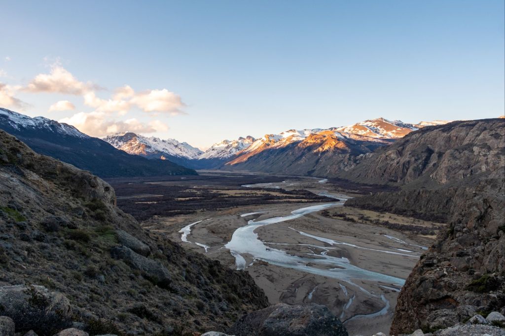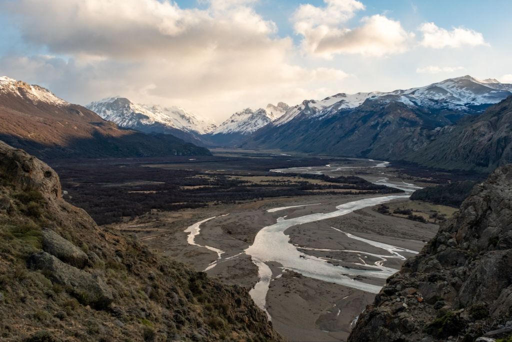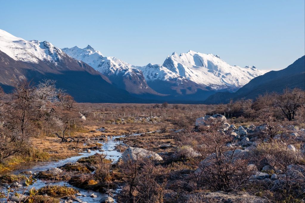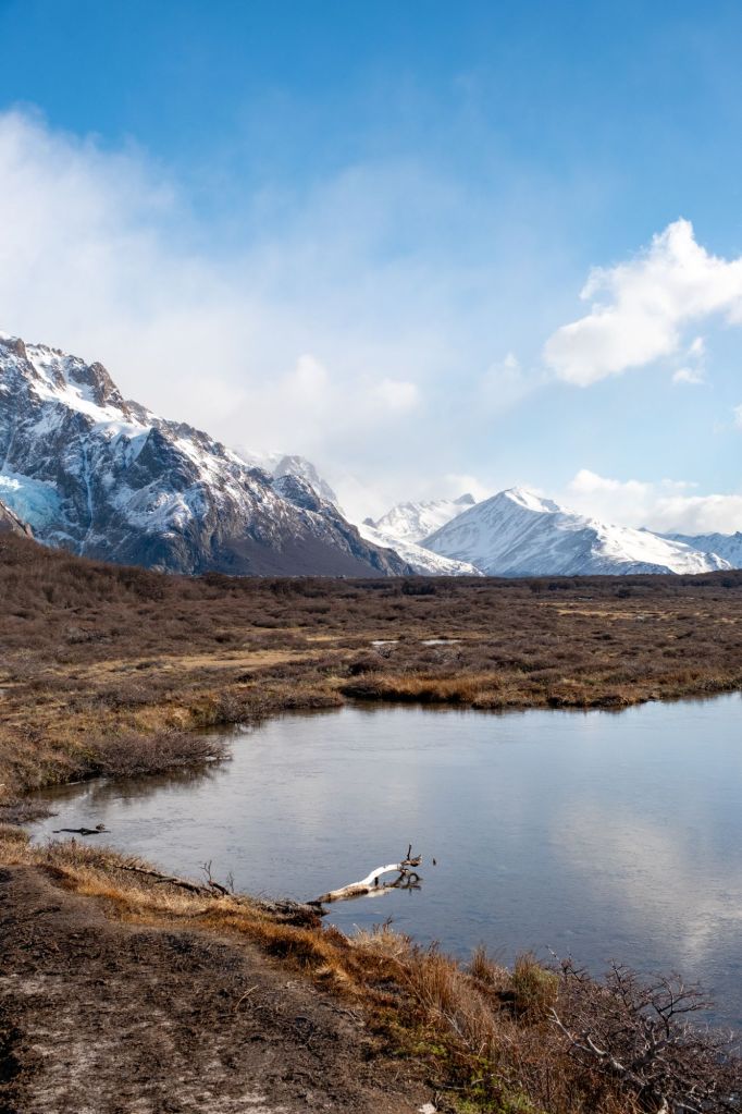 Aujourd’hui nous profitons de la plus belle journée de la semaine pour aller faire la randonnée jusqu’au pied du Fitz Roy. Nous partons à 8h avec Lionel et Marie depuis le village, et empruntons le sentier de la Laguna de los Tres. Le début du sentier est plat, nous marchons dans la jolie vallée où coule une rivière, entourée de montagnes enneigées.
