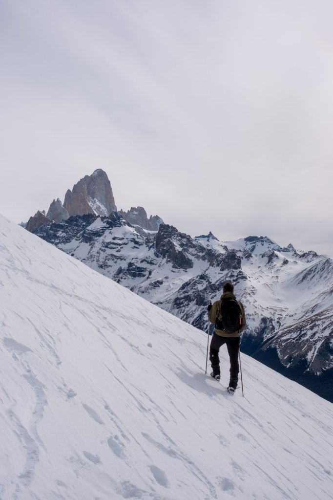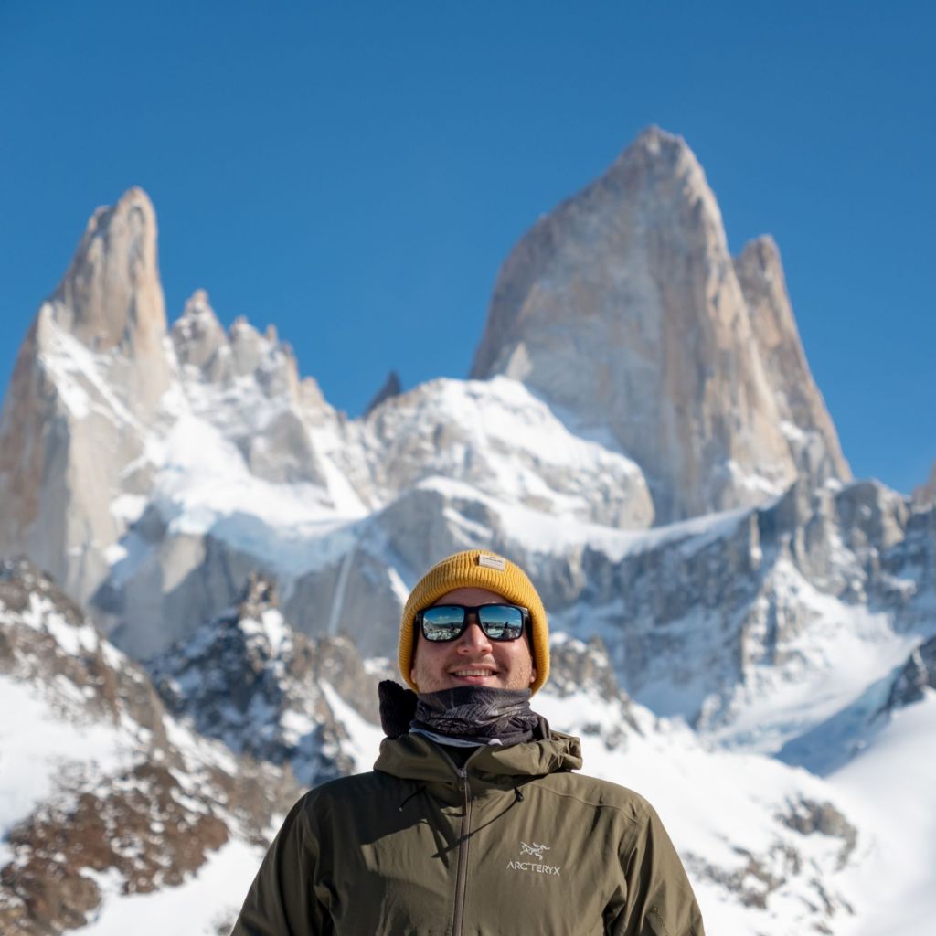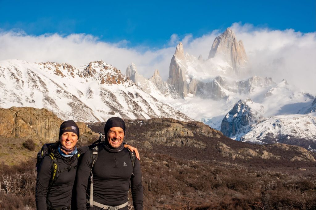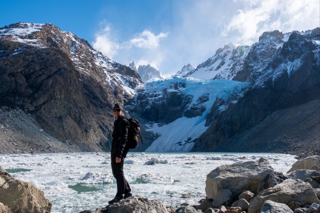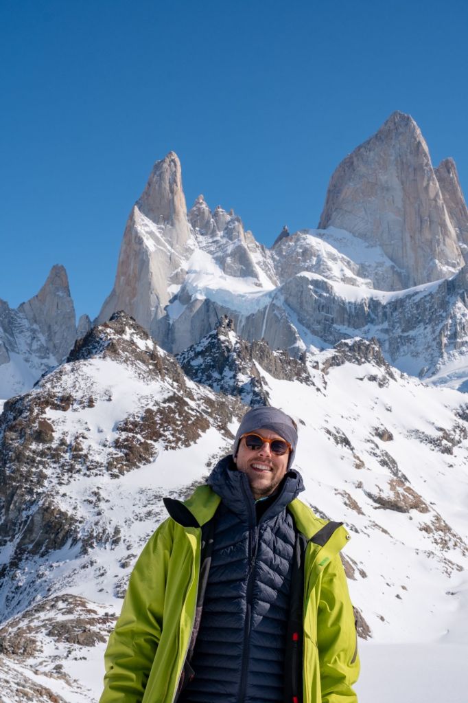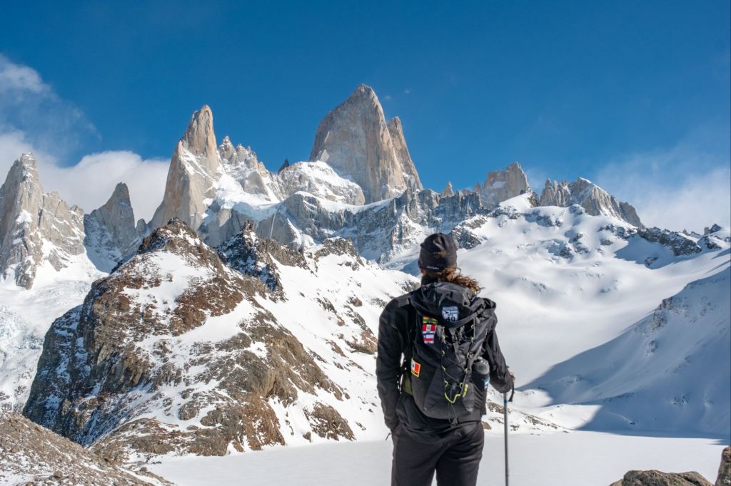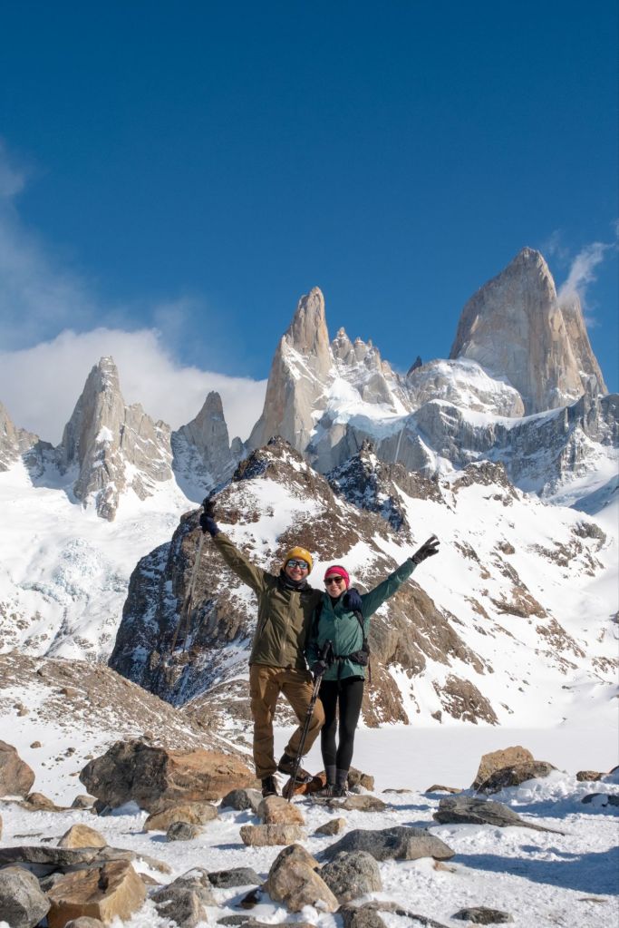 Nous arrivons au sommet de la randonnée, au pied de la Laguna de Los Tres, elle-même au pied du Fitz Roy. Le paysage est incroyable : la lagune est gelée et recouverte de neige, et le Fitz Roy se dresse fièrement devant nous, sous le ciel bleu.