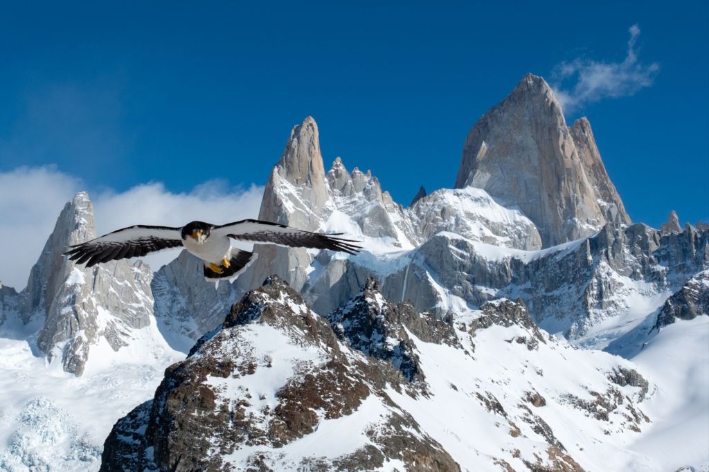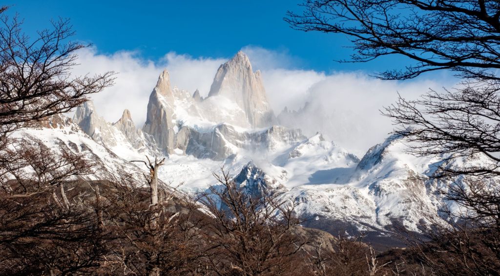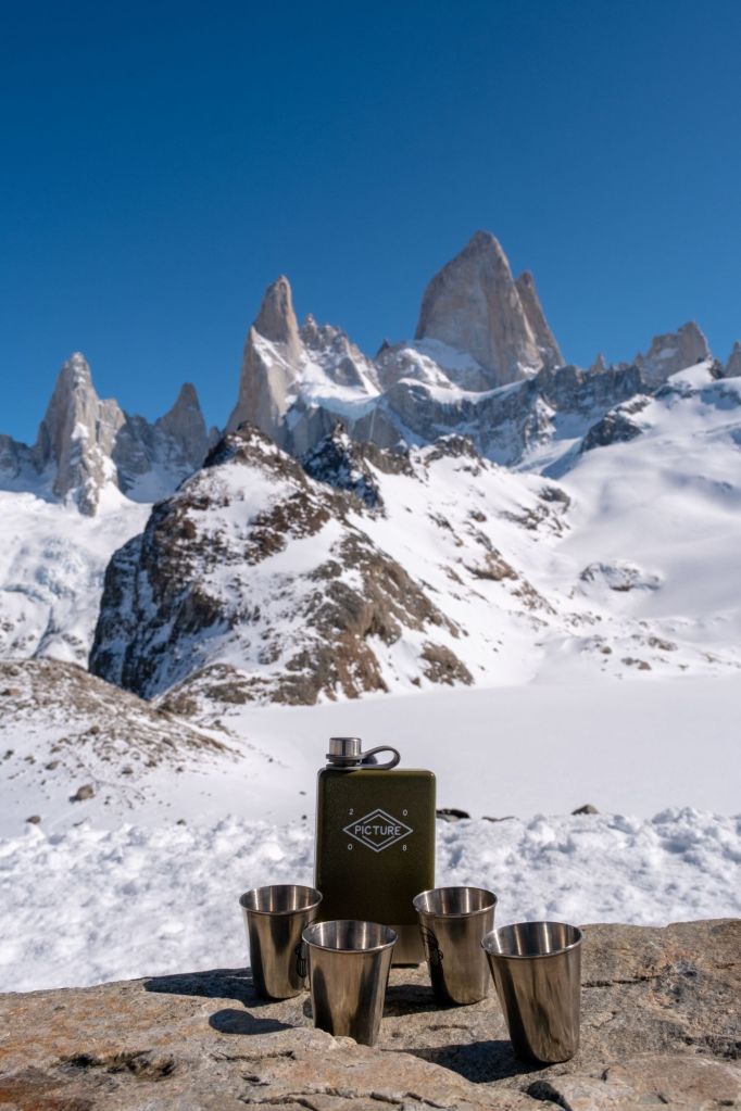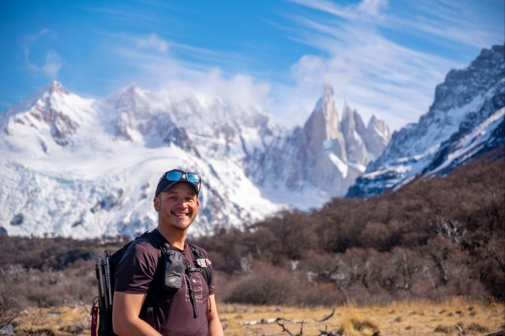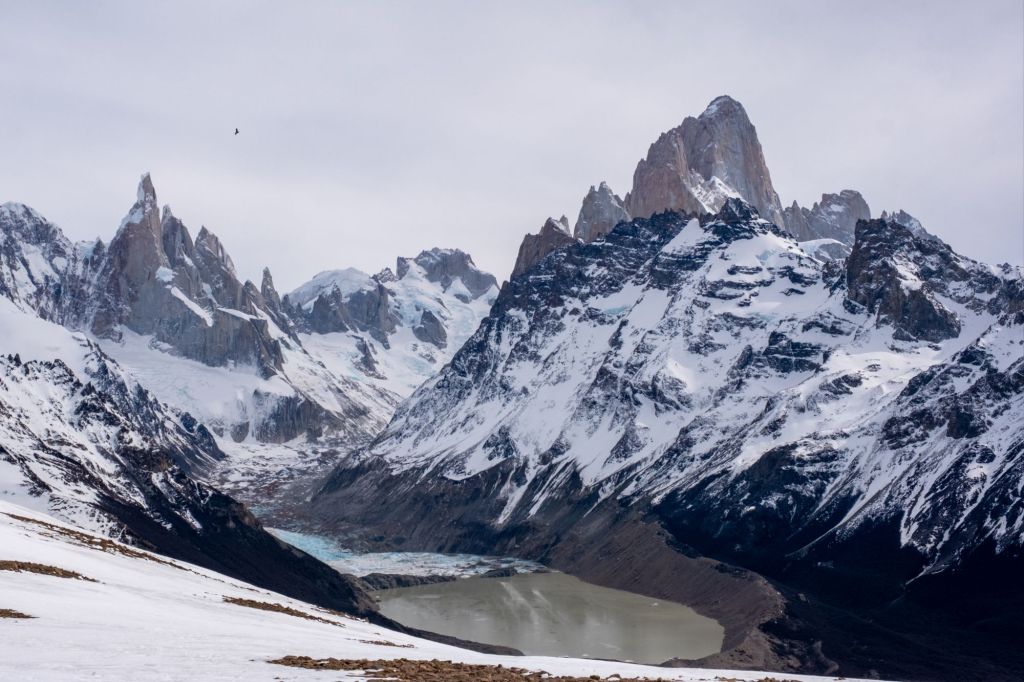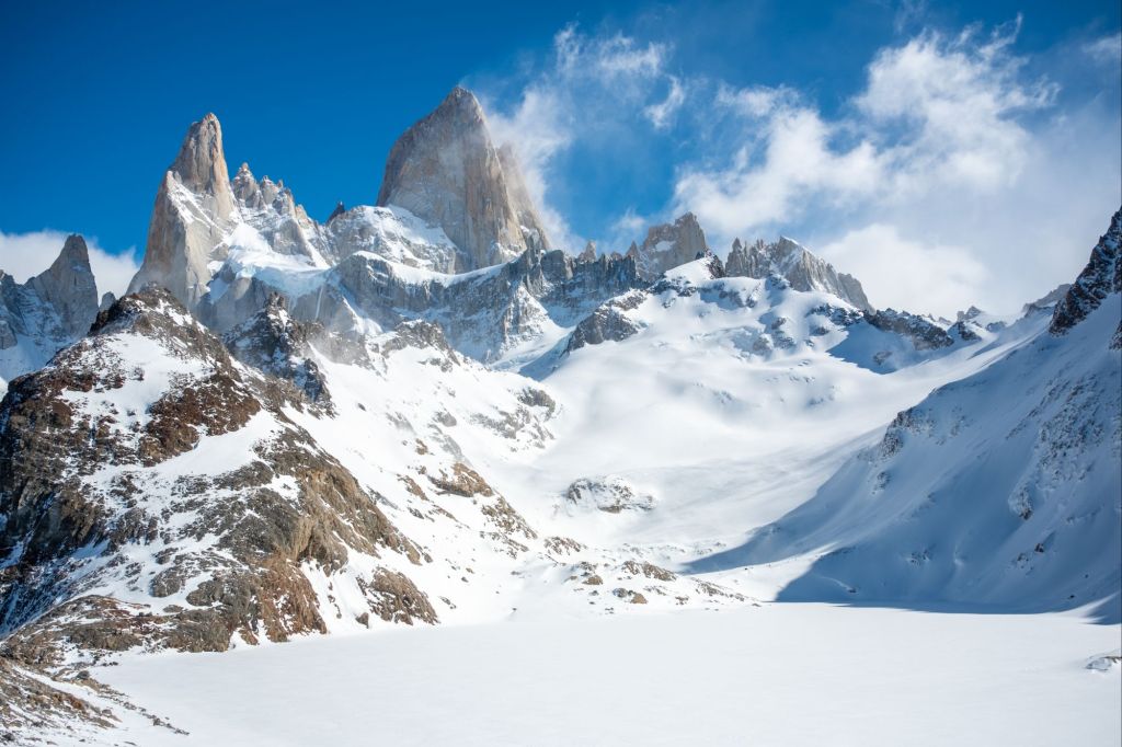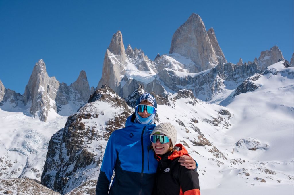 Nous arrivons au sommet de la randonnée, au pied de la Laguna de Los Tres, elle-même au pied du Fitz Roy. Le paysage est incroyable : la lagune est gelée et recouverte de neige, et le Fitz Roy se dresse fièrement devant nous, sous le ciel bleu.