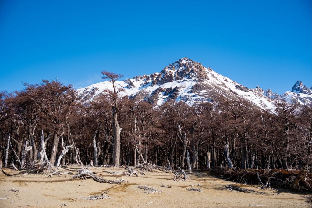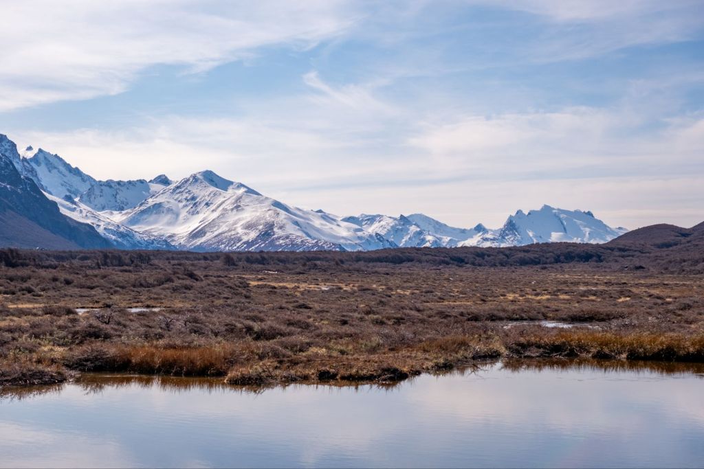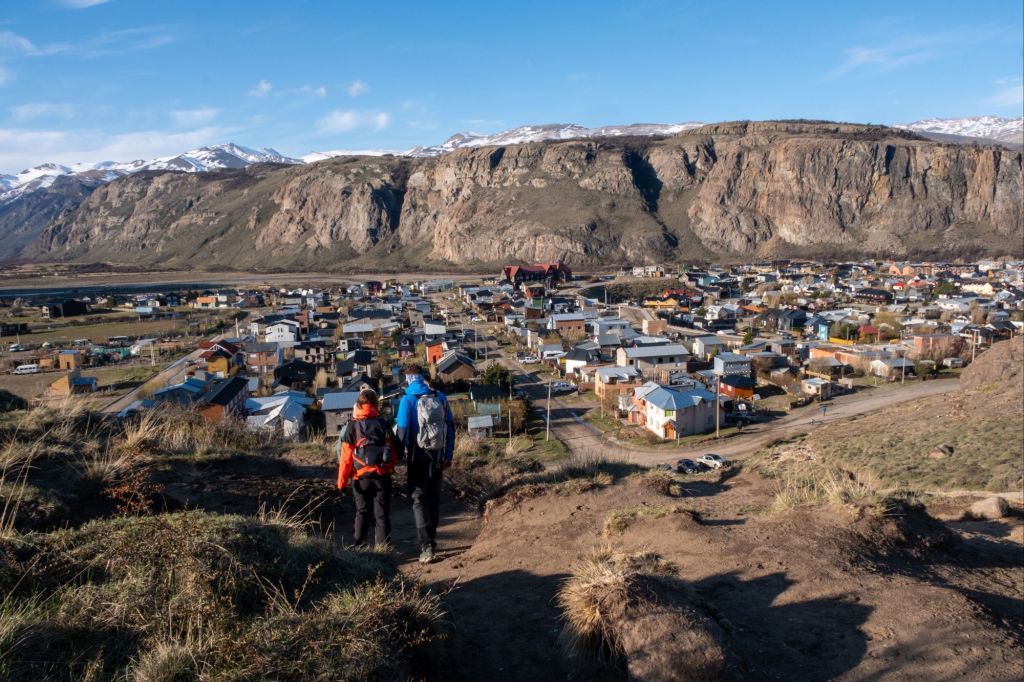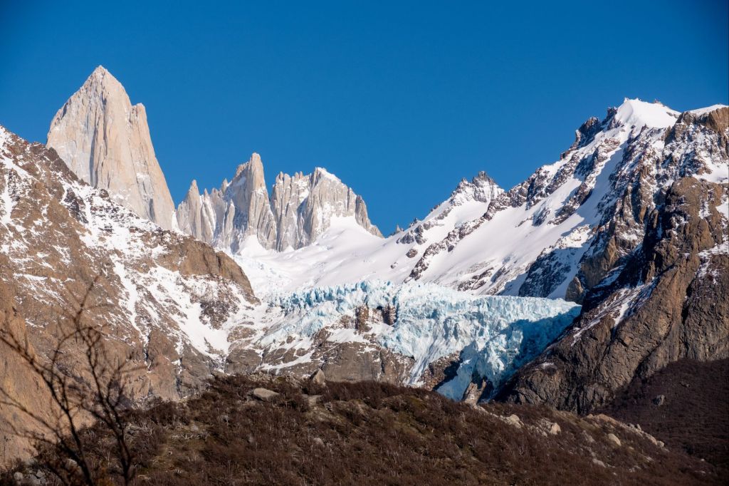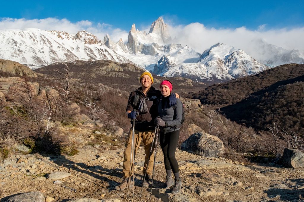 Nous nous levons à 3h du matin pour prendre notre vol pour El Calafate et débuter notre périple en Patagonie. Nous y arrivons dans la matinée, après avoir admiré le paysage depuis notre hublot : montagnes enneigées, lagunes, tout a l’air magnifique ! Nous nous rendons directement à la gare routière pour récupérer les coordonnées des différentes compagnies de bus et pouvoir organiser la suite du voyage. Là, nous rencontrons Marie et Lionel, un couple de français qui voyage à vélo et qui se rend aussi à El Chalten. Nous grimpons dans le premier bus avec eux, et filons vers la capitale de la randonnée. Nous nous arrêtons en chemin pour manger des petits empañadas potiron-fromage, et poursuivons notre route. Le paysage est magnifique, nous longeons le lac Viedma et apercevons même le glacier du même nom. De nombreux guanacos broutent les quelques buissons d’herbes jaunies qui parsèment les bords de la route. Puis, au détour d’un virage, le Fitz Roy se dévoile devant nous : c’est absolument incroyable, la montagne a une forme magnifique et surplombe la ville d’El Chalten. Nos quelques jours ici risquent d’être magnifiques !
