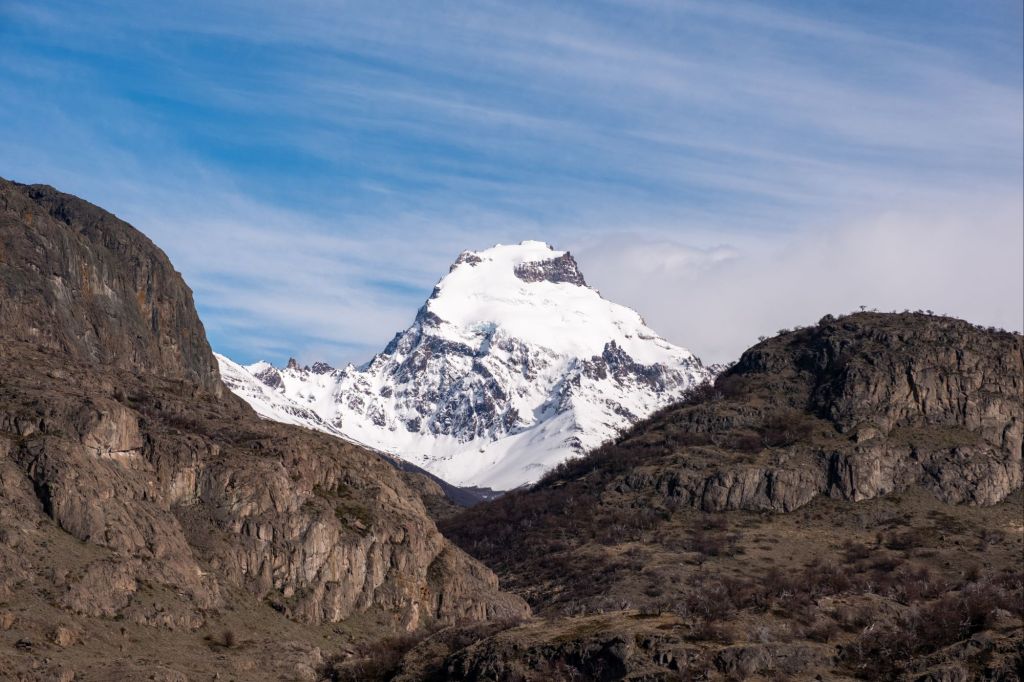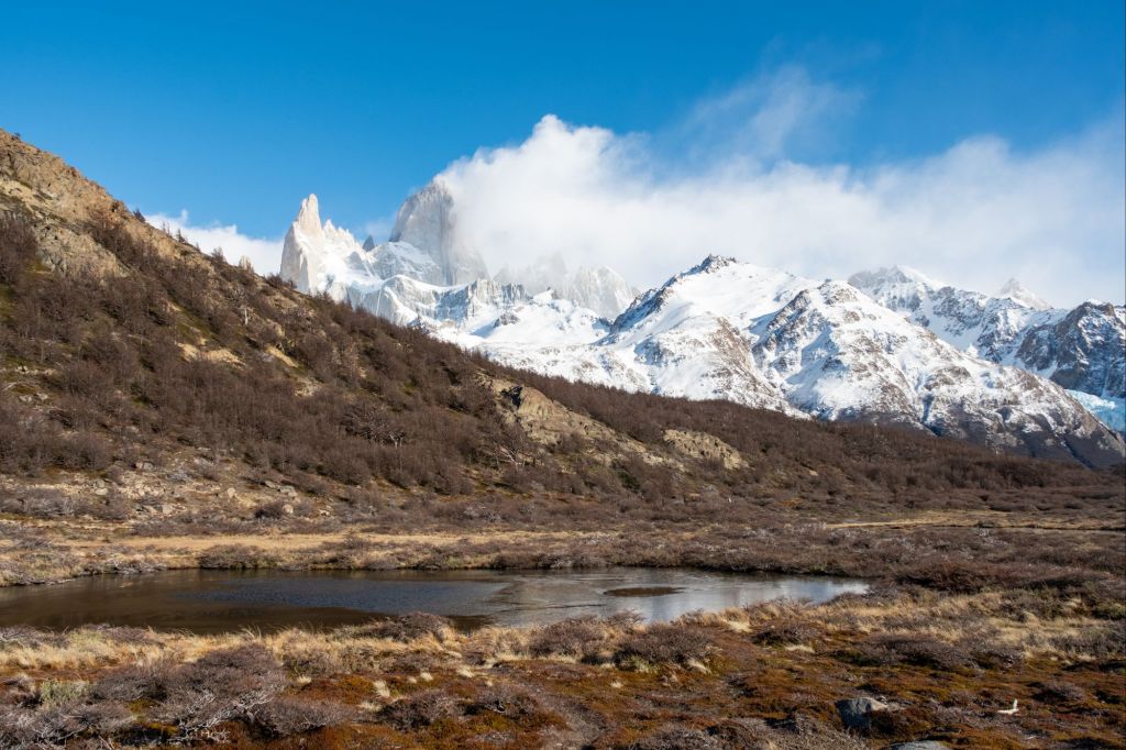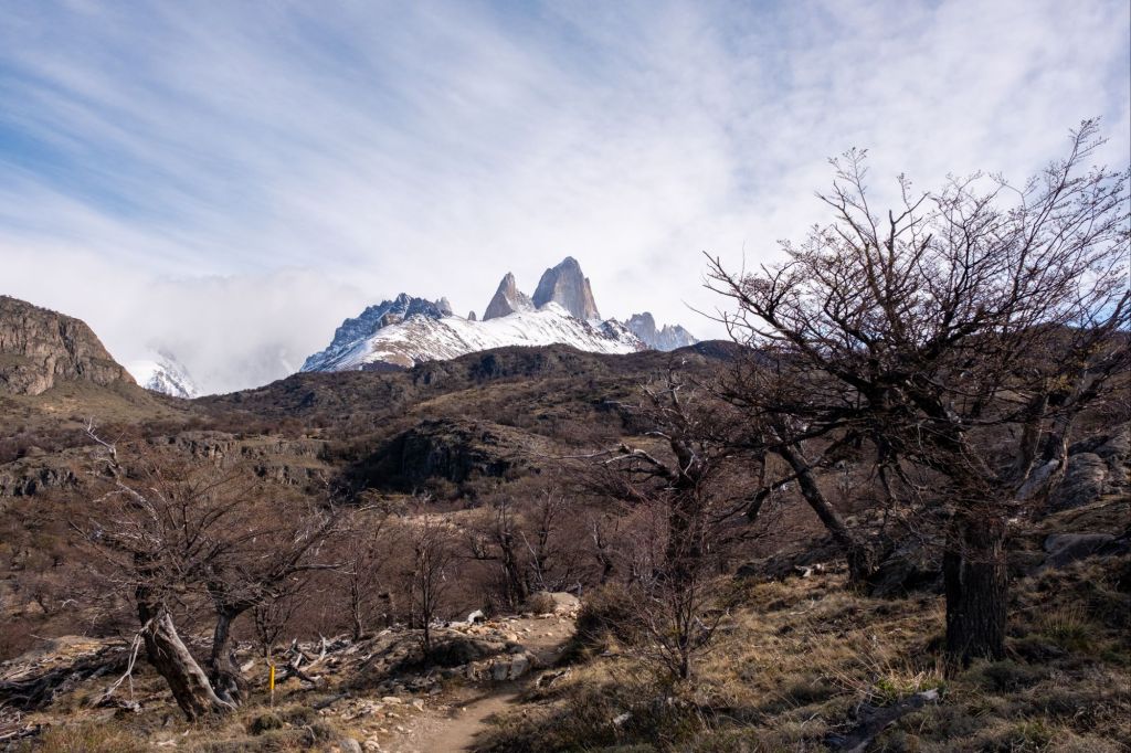 Nous commençons à prendre un peu de hauteur et arrivons au premier mirador du chemin : une magnifique vue sur le mont Fitz Roy. Cette fameuse montagne bien découpée est magnifique, avec son petit nuage accroché au sommet.