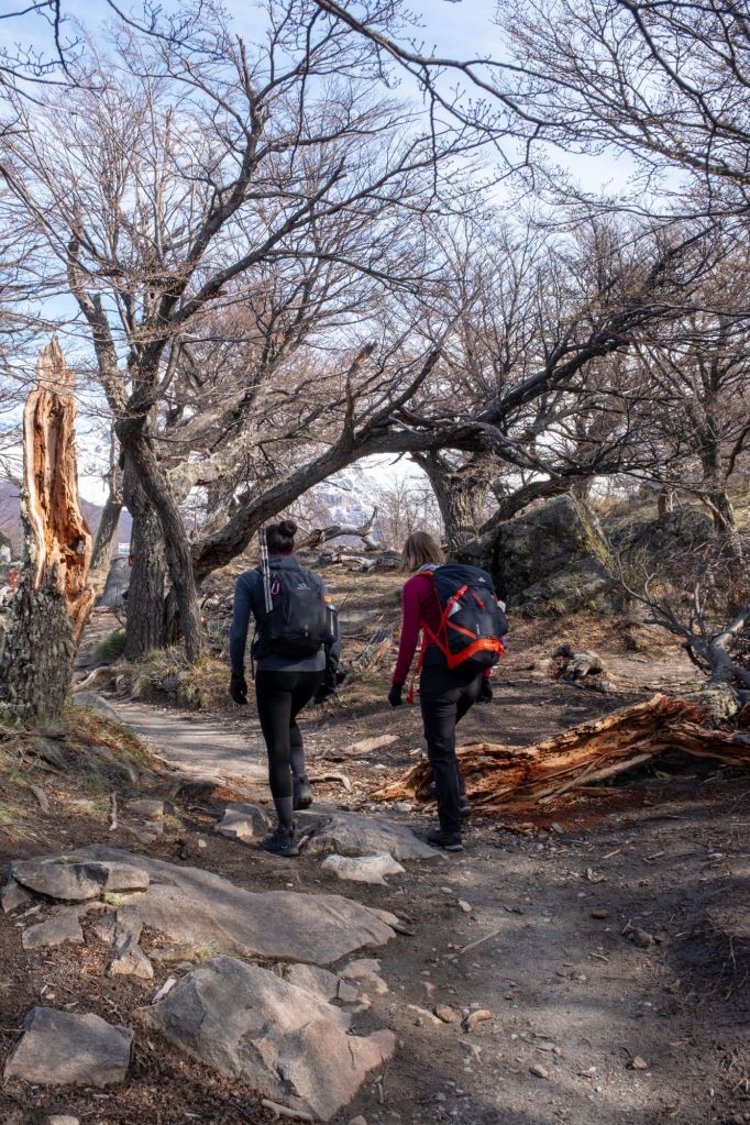 Nous profitons de la matinée pour dormir, et allons chercher nos copains qui arrivent ce matin en bus : Thomas, Jeanne et Jules, qui nous rejoignent pour 2 semaines. Comme il fait un temps magnifique, nous achetons quelques sandwichs, posons leurs sacs à l’auberge, et partons directement randonner pour profiter de la journée. Le sentier commence juste devant notre auberge, et le début est plutôt plat, ce qui nous permet de discuter et rattraper le temps perdu avec les copains. Nous marchons sur un sol aride avec peu de végétation, ou les quelques buissons côtoient les arbres dénudés.