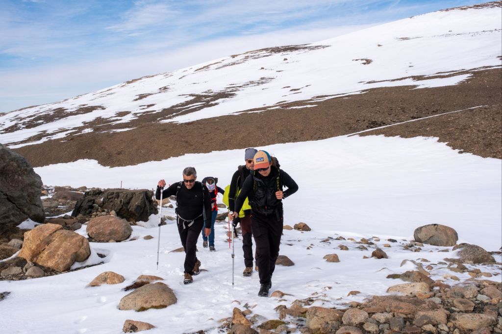 Pour rentabiliser les crampons qu’ils ont emmené, ils décident de tous grimper au sommet d’un petit mont enneigé et glacé. Les photos sont impressionnantes !