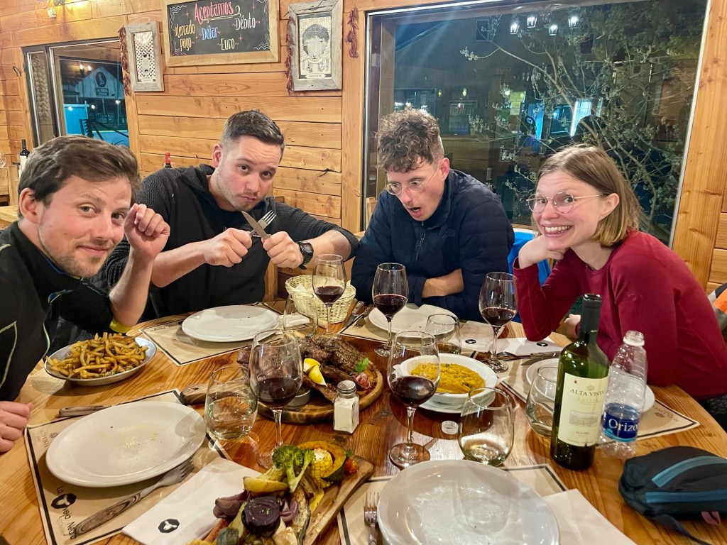 Nous faisons demi tour et redescendons tranquillement vers le village. Je commence à sentir une petite douleur au niveau de mon talon gauche, sans y prêter trop d’attention. Nous passons faire des courses puis allons dîner dans un des seuls restaurants ouverts pour fêter nos retrouvailles. C’est une parilla, la Oveja Negra. Nous commandons différentes viandes à partager et tout est absolument savoureux et bien cuit, même les accompagnements sont très bons.