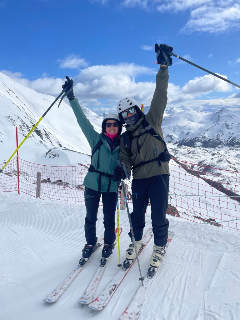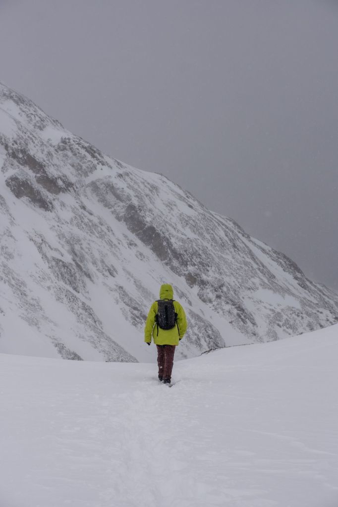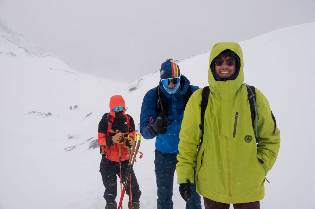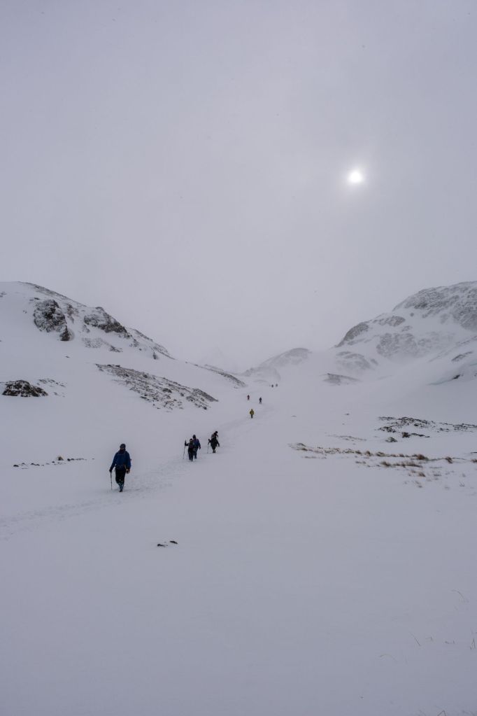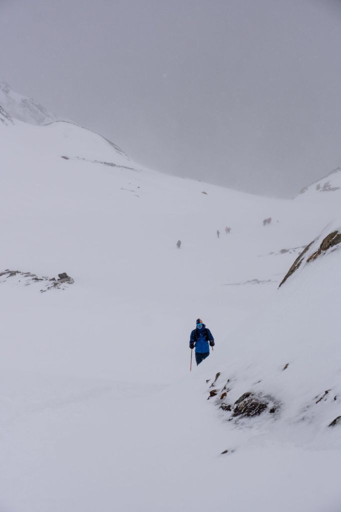 Nous profitons au maximum de la journée en skiant jusqu’à la fermeture des remontées mécaniques. Le vent se lève en fin d’après-midi et nous terminons notre descente complètement gelés !