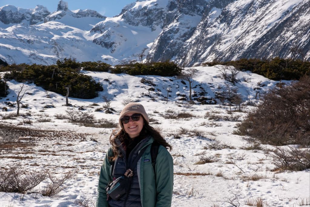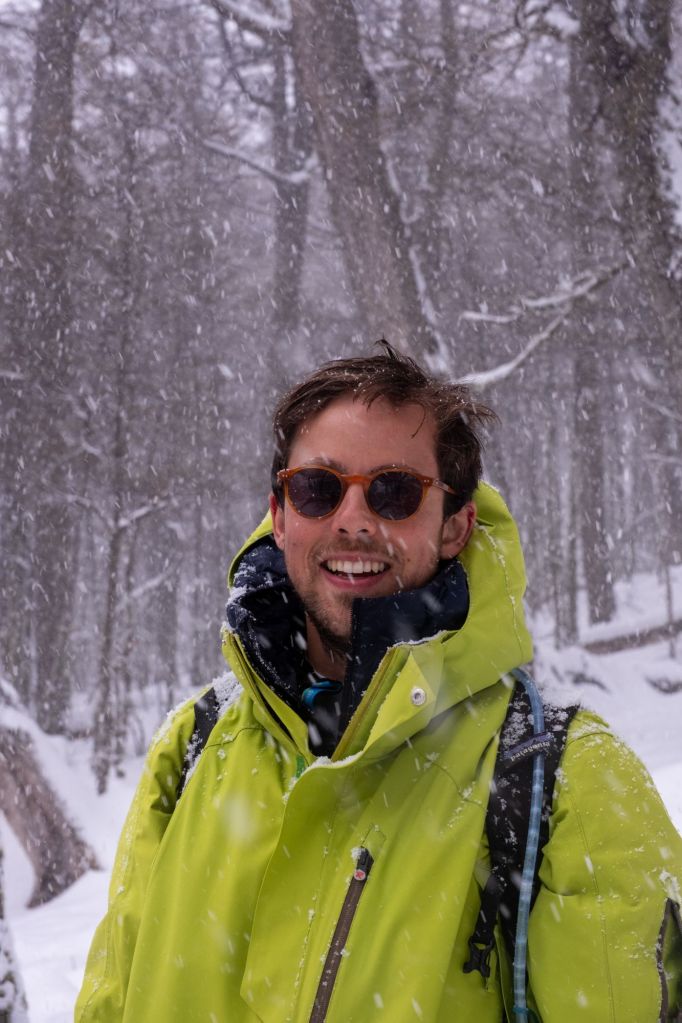 Les montagnes enneigées sont magnifiques, tout autour de nous. Après une dernière petite montée glissante dans une forêt enneigée, nous arrivons à la Laguna Esmeralda. En été elle prend une belle couleur verte, comme son nom l’indique, mais pour nous elle est entièrement gelée ! Nous nous promenons donc sur le lac, au milieu des montagnes enneigées, l’endroit est magique !