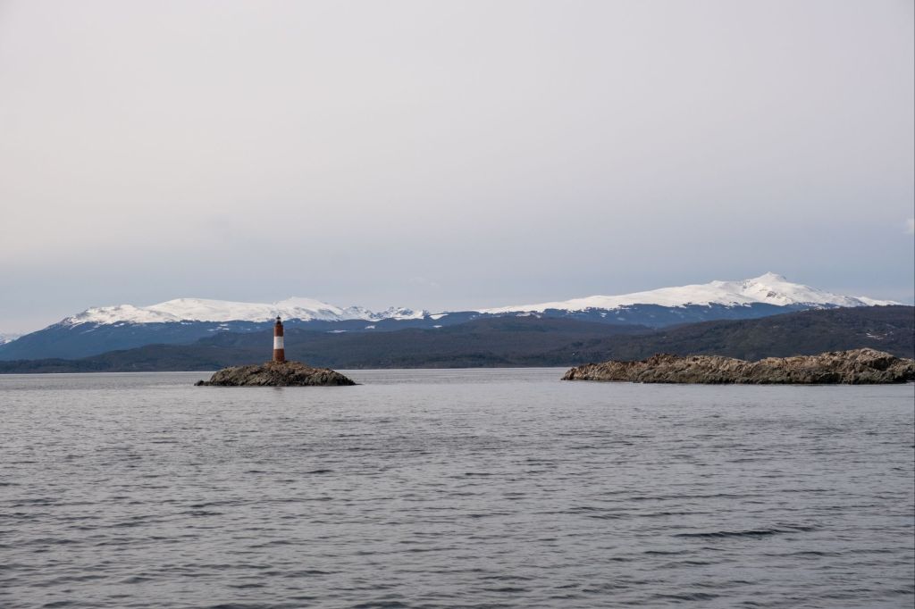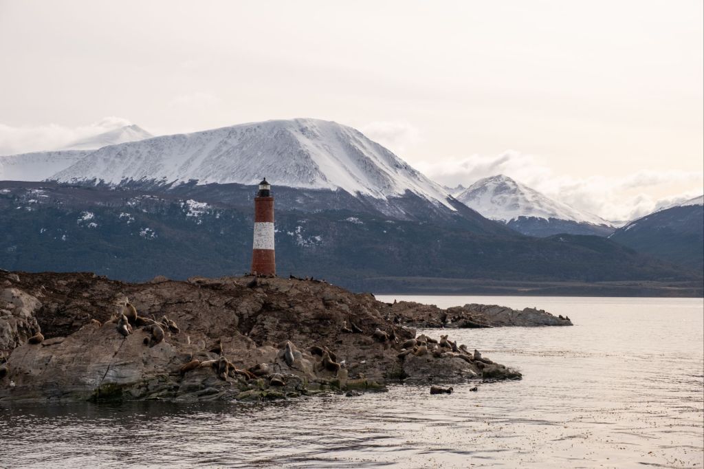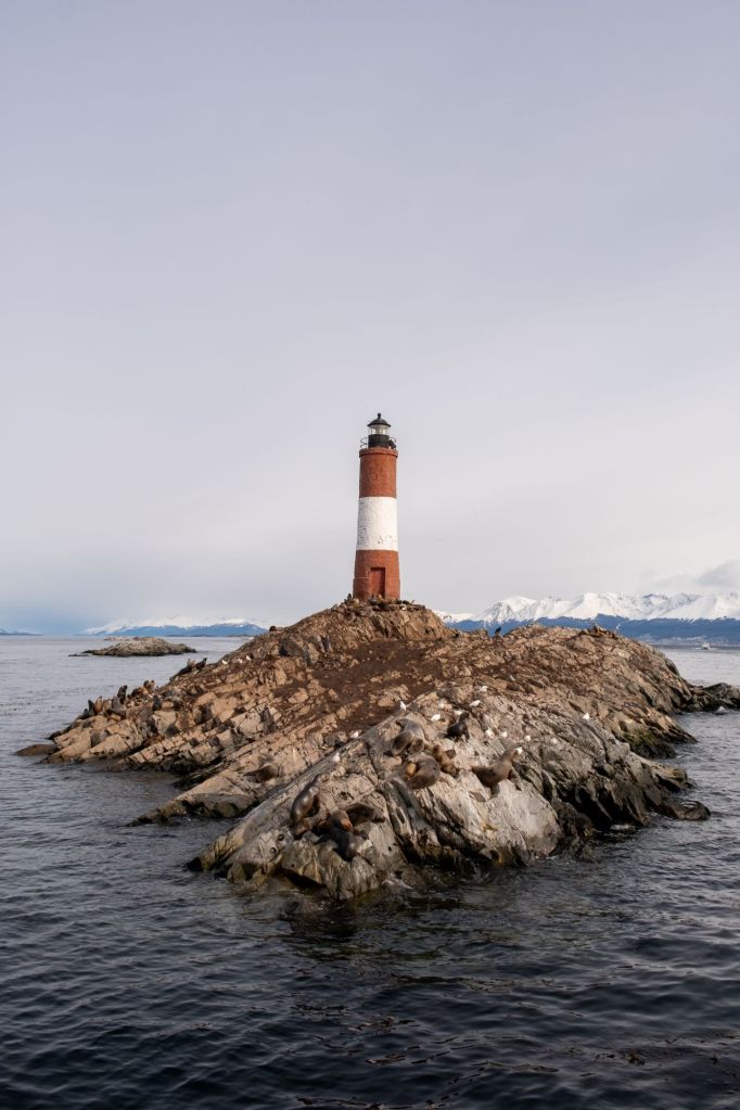 Nous partons ce matin en croisière sur le canal de Beagle avec Catamaranes Canoero. Ce n’est malheureusement pas encore la saison des pingouins, nous n’aurons donc pas la chance d’en voir ici. La partie inférieure du bateau est remplie de plusieurs classes d’enfants très bruyants, la traversée risque de ne pas être reposante ! Nous commençons par faire le tour du Phare des Éclaireurs, un étonnant phare rouge et blanc posé sur une minuscule île au milieu du canal. Cette île est habitée de centaines de phoques qui se prélassent sur les rochers. Nous apercevons également de nombreux cormorans noirs et blancs.