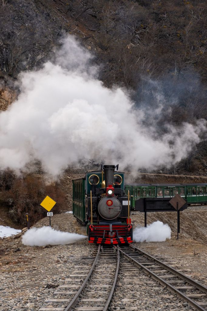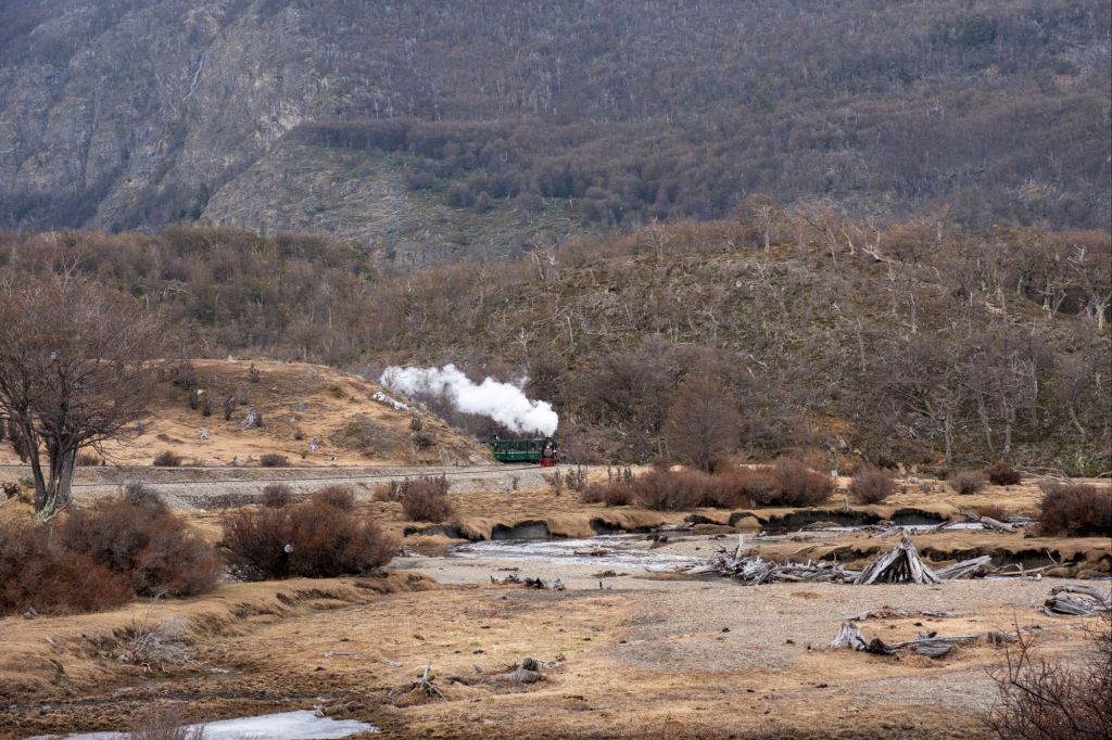 Une navette vient nous chercher ce matin pour aller au fameux parc Tierra del Fuego. Nous commençons la journée par le Tren del fin del Mundo (le train du bout du monde). C’est la ligne de train la plus australe au monde. Elle était utilisée au début du 20ème siècle par les prisonniers envoyés à Ushuaïa, pour transporter le bois de chauffage de la forêt à la prison. Pour nous mettre dans l’ambiance, on nous fait nous prendre en photo avec des faux prisonniers avant de monter dans le train. La petite locomotive aux couleurs verte et rouge qui nous tire a une allure de jouet, et elle jette de temps en temps des nuages de vapeur.