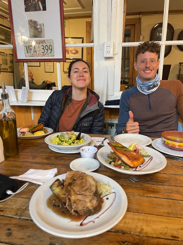Nous retrouvons ensuite Elsa et Thibaud (qui viennent d’arriver à Ushuaïa) au bar Patagonia pour déguster une petite bière locale. Nous allons ensuite dîner tous les 6, avec Lionel et Marie, à la Pizzeria Dieguito, pour fêter notre départ. C’est un restaurant rempli de locaux où l’on mange copieusement pour pas cher ! Nous prenons également des empañadas pour notre bus de demain, car tous les locaux du quartier font la queue pour en acheter, elles doivent être bonnes ! Demain, nous partons de nouveau pour le Chili.